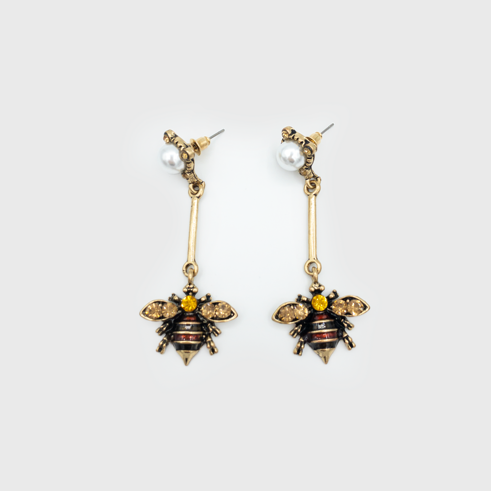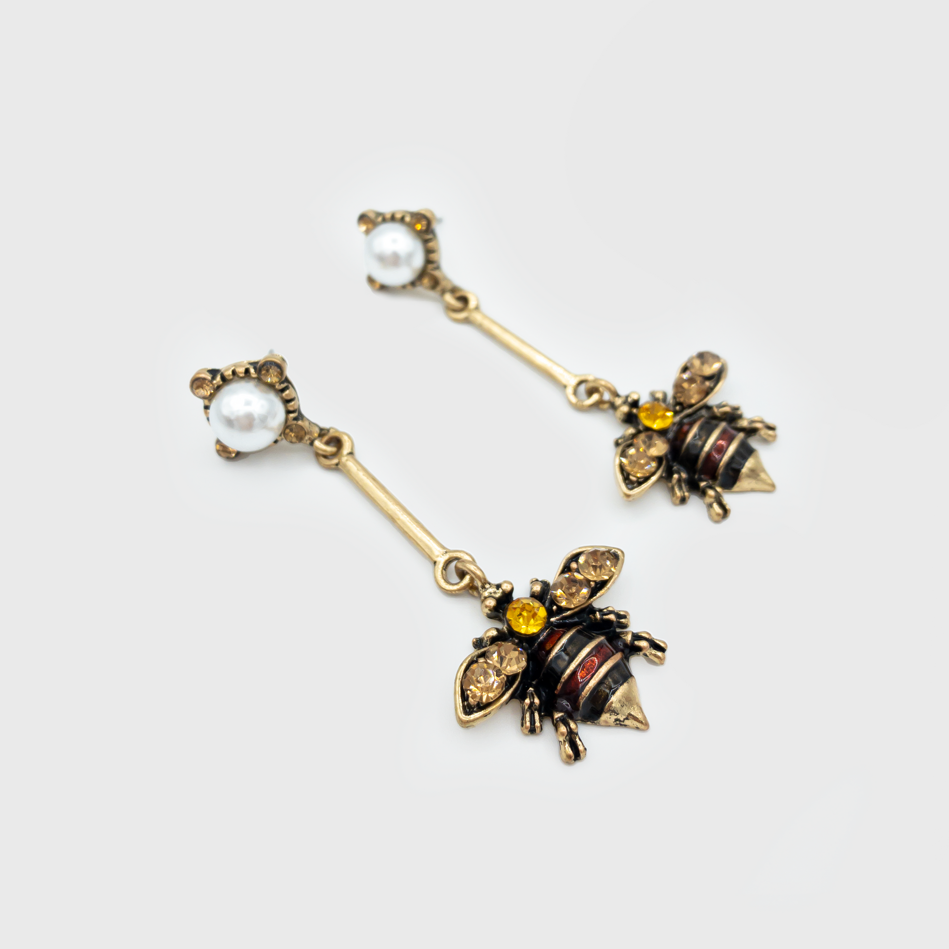 - Cercei din metal in forma de albina, decorati cu strasuri de sticla si perla sintetica