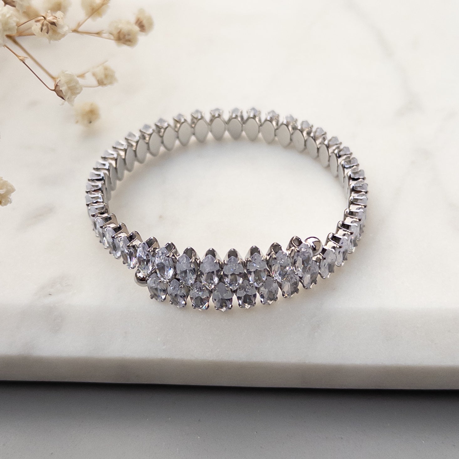 - Bratara flexibila fabricata din oțel inoxidabil, cu cristale de zirconiu aplicate.