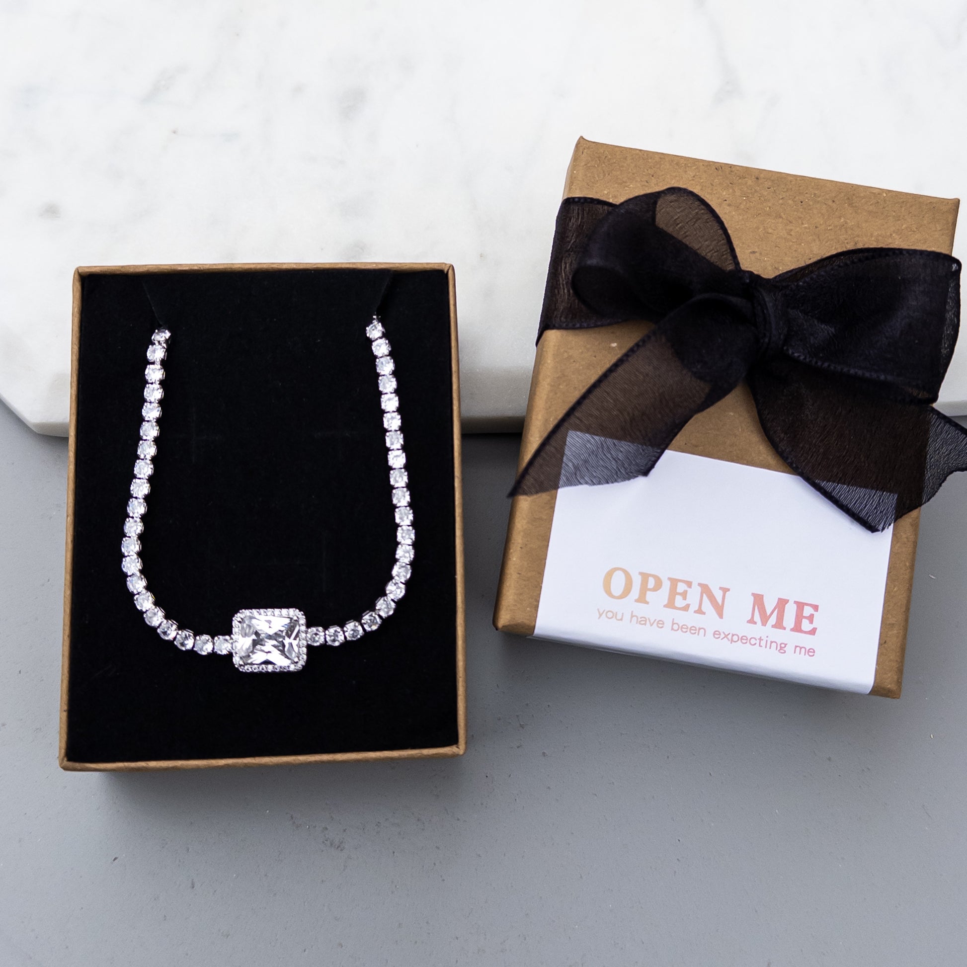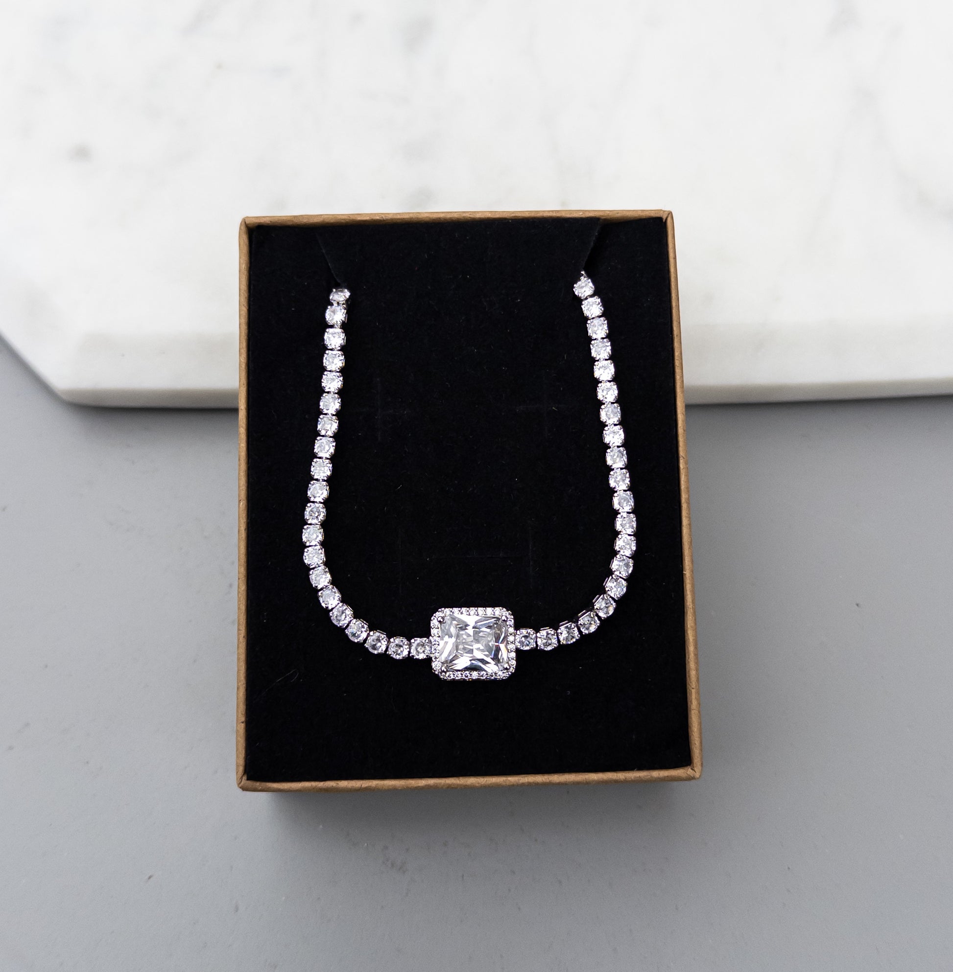 - Colier fabricat din oțel inoxidabil, cu cristale de zirconiu aplicate.