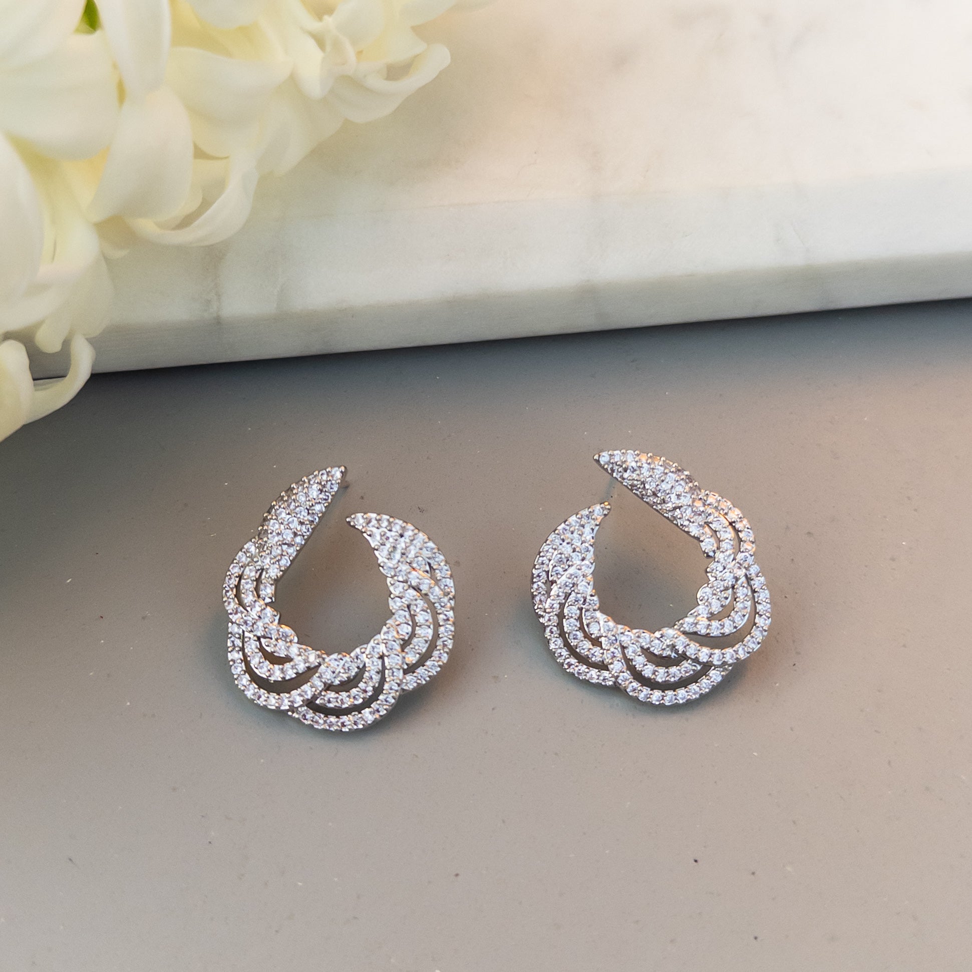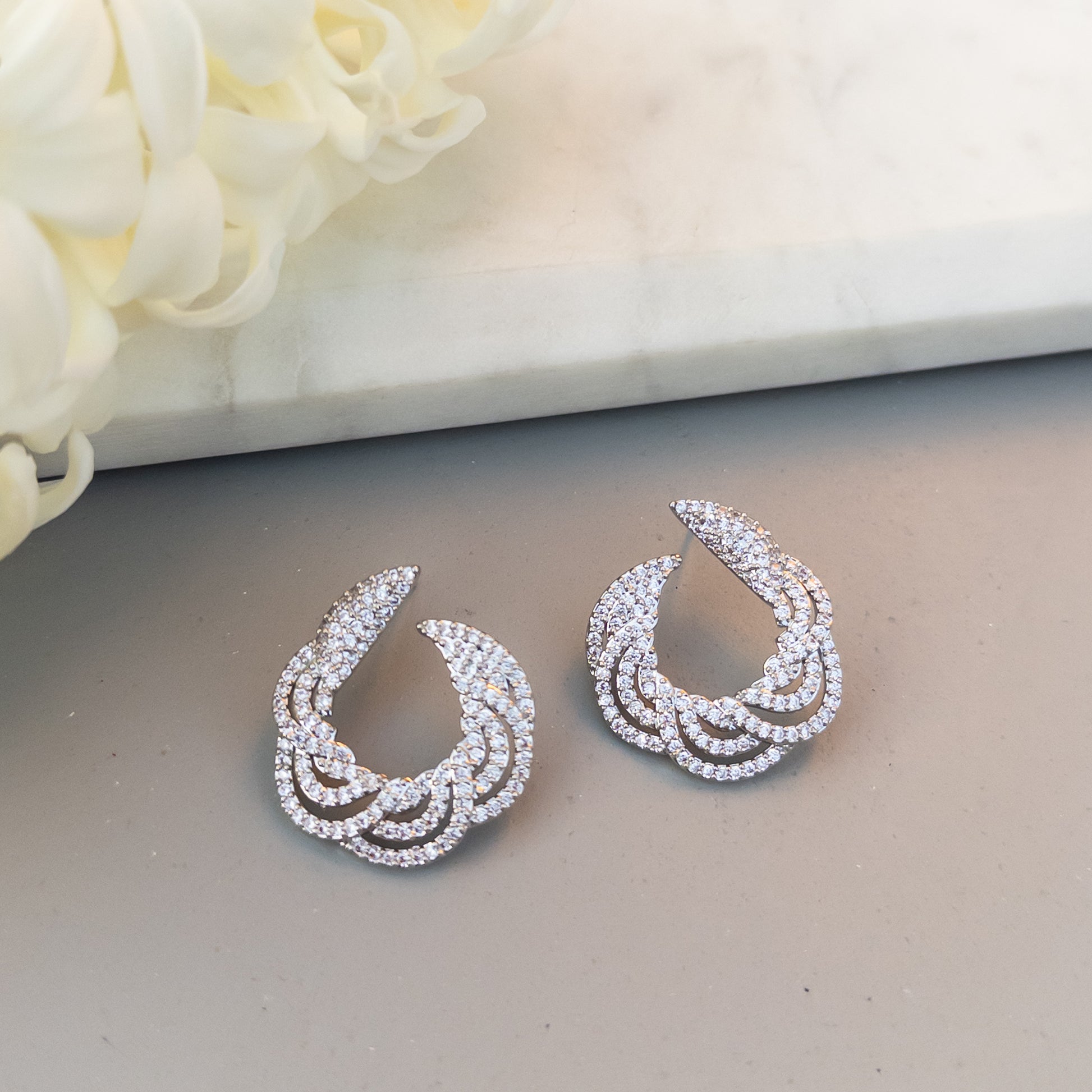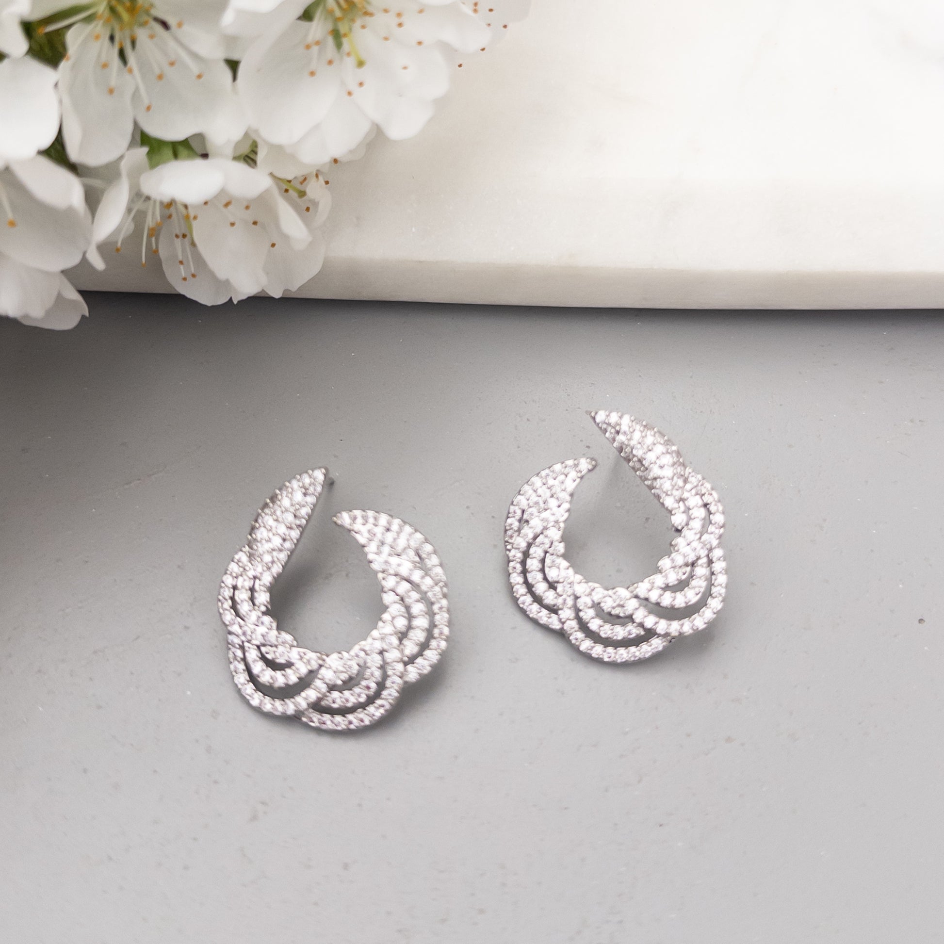 - Cercei fabricati din oțel inoxidabil, placati cu rodiu, cu cristale de zirconiu aplicate.