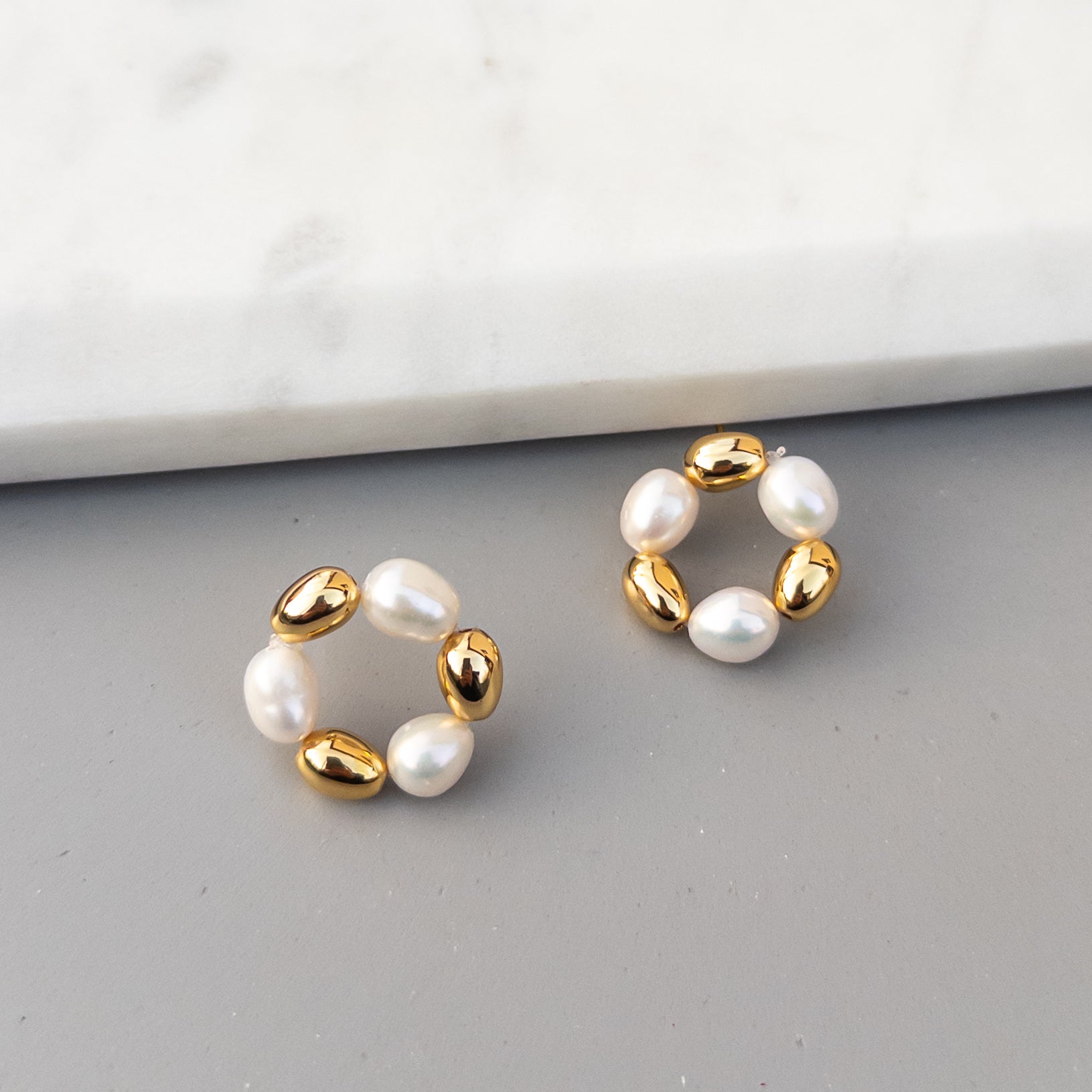 - Cercei flexibili fabricati din oțel inoxidabil, placat cu aur și perle.