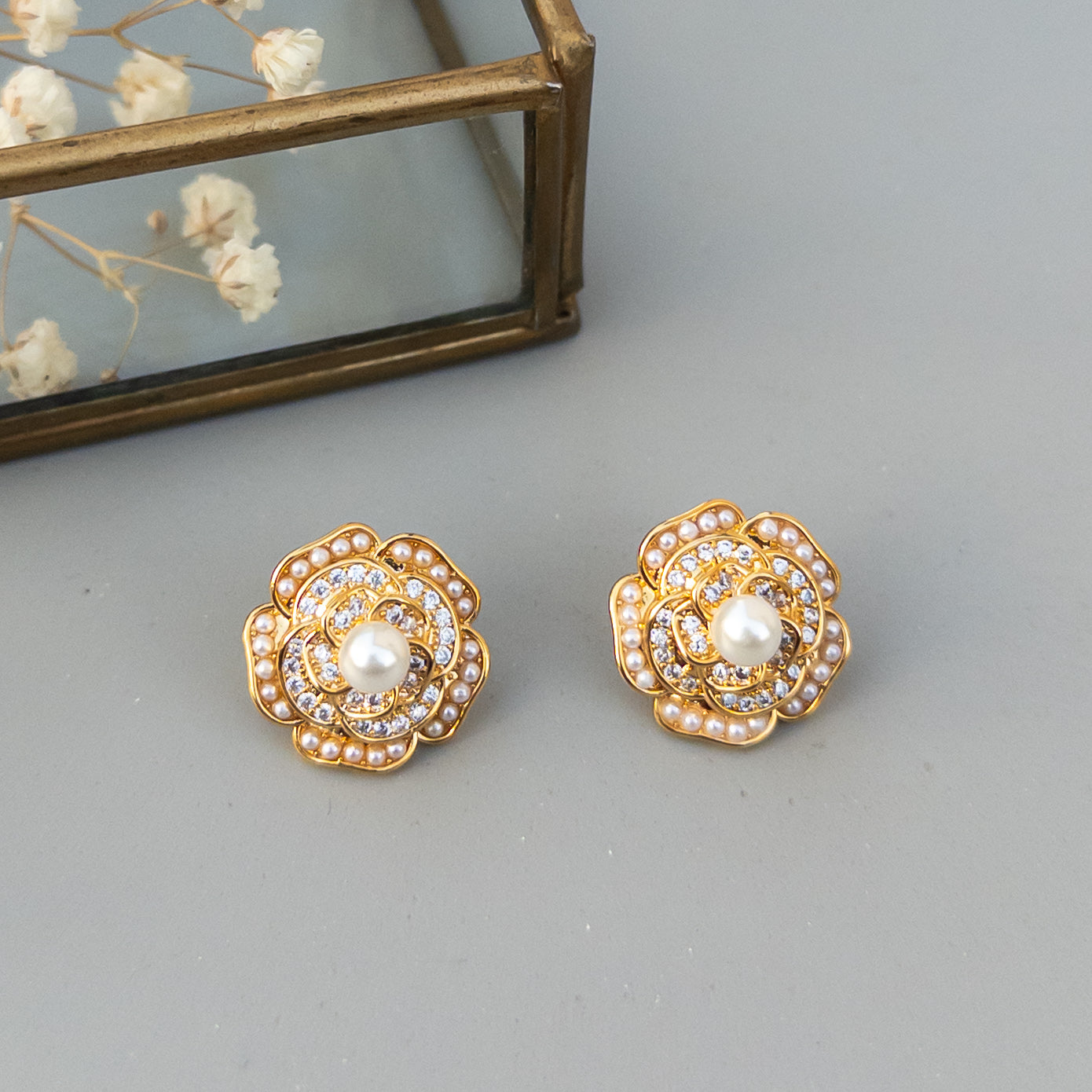 - Cercei fabricati din oțel inoxidabil, placati cu rodiu, cu cristale de zirconiu și perle aplicate.