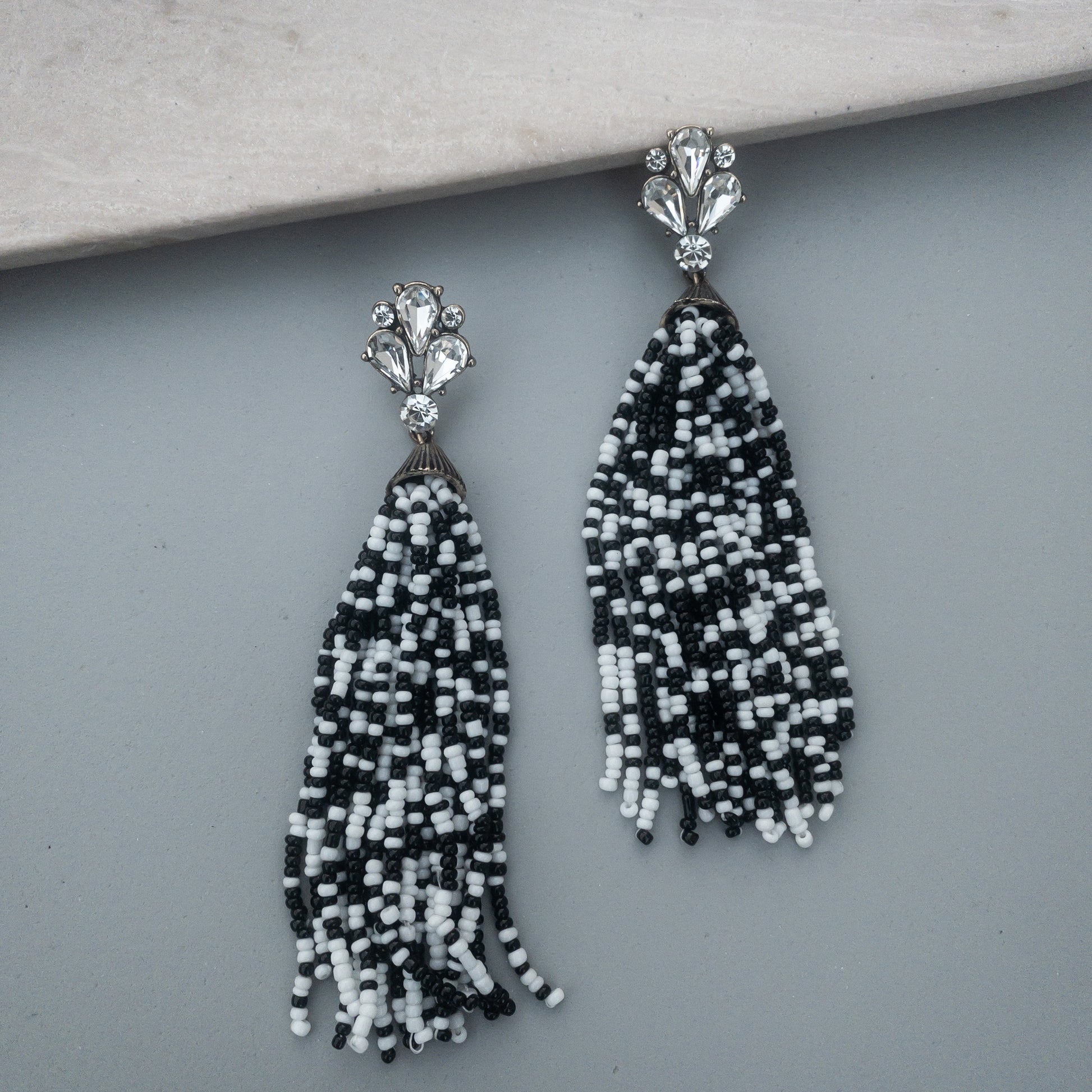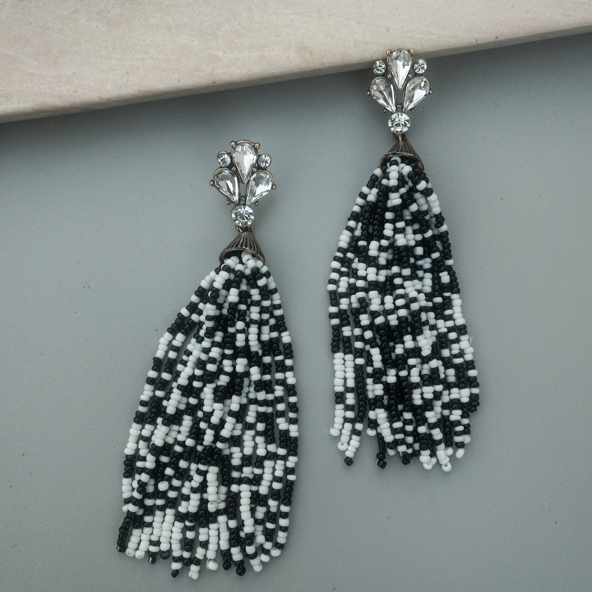 - Cercei fabricati din metal, cu cristale de sticla și material acrilic.