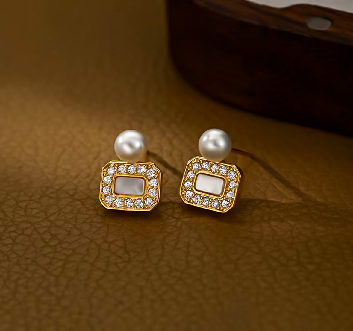 - Cercei fabricati din oțel inoxidabil, placati cu rodiu, cu cristale de zirconiu si perle aplicate.