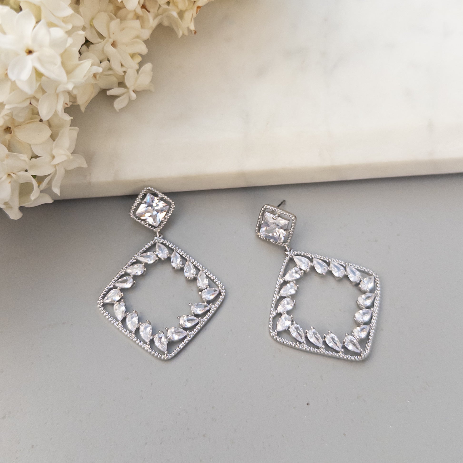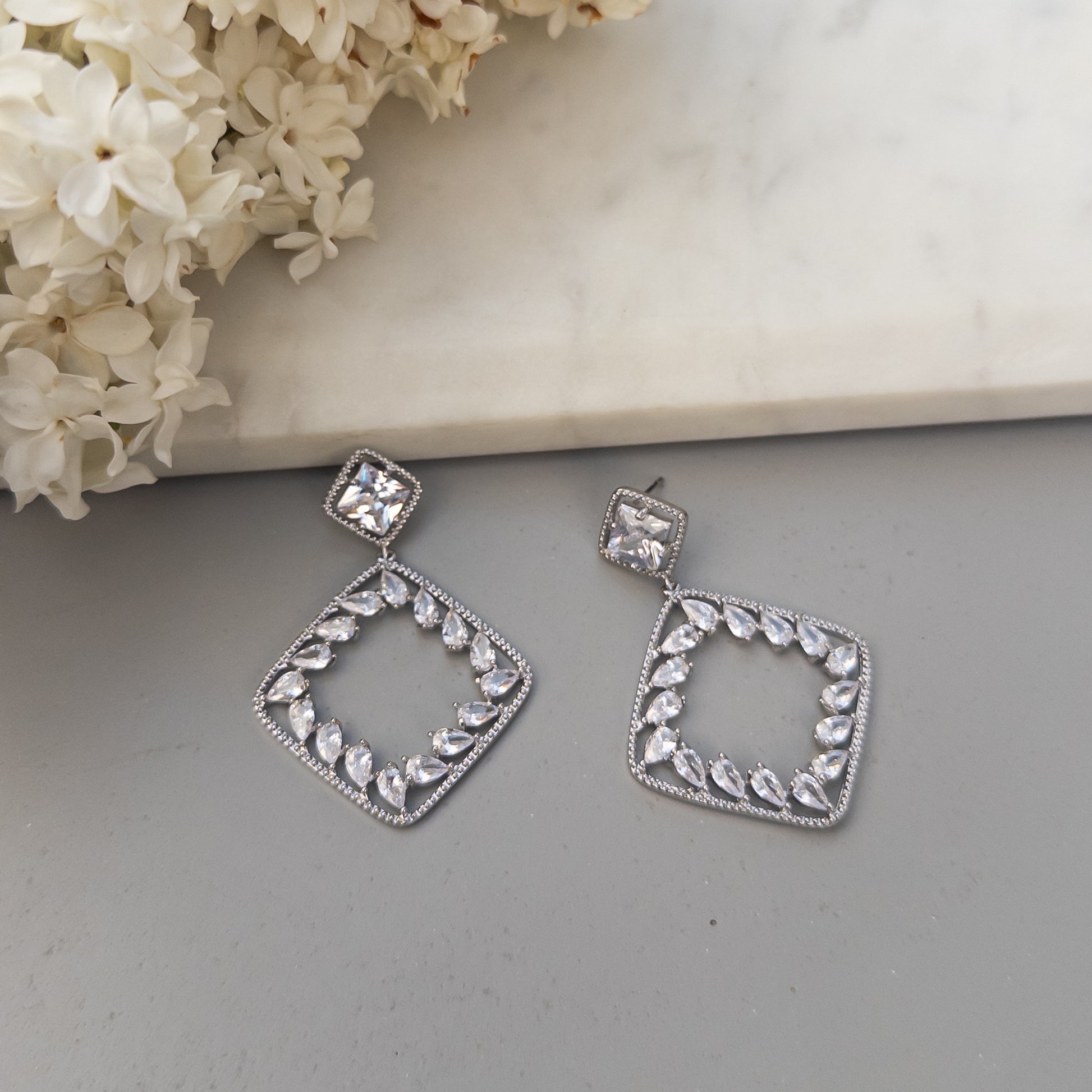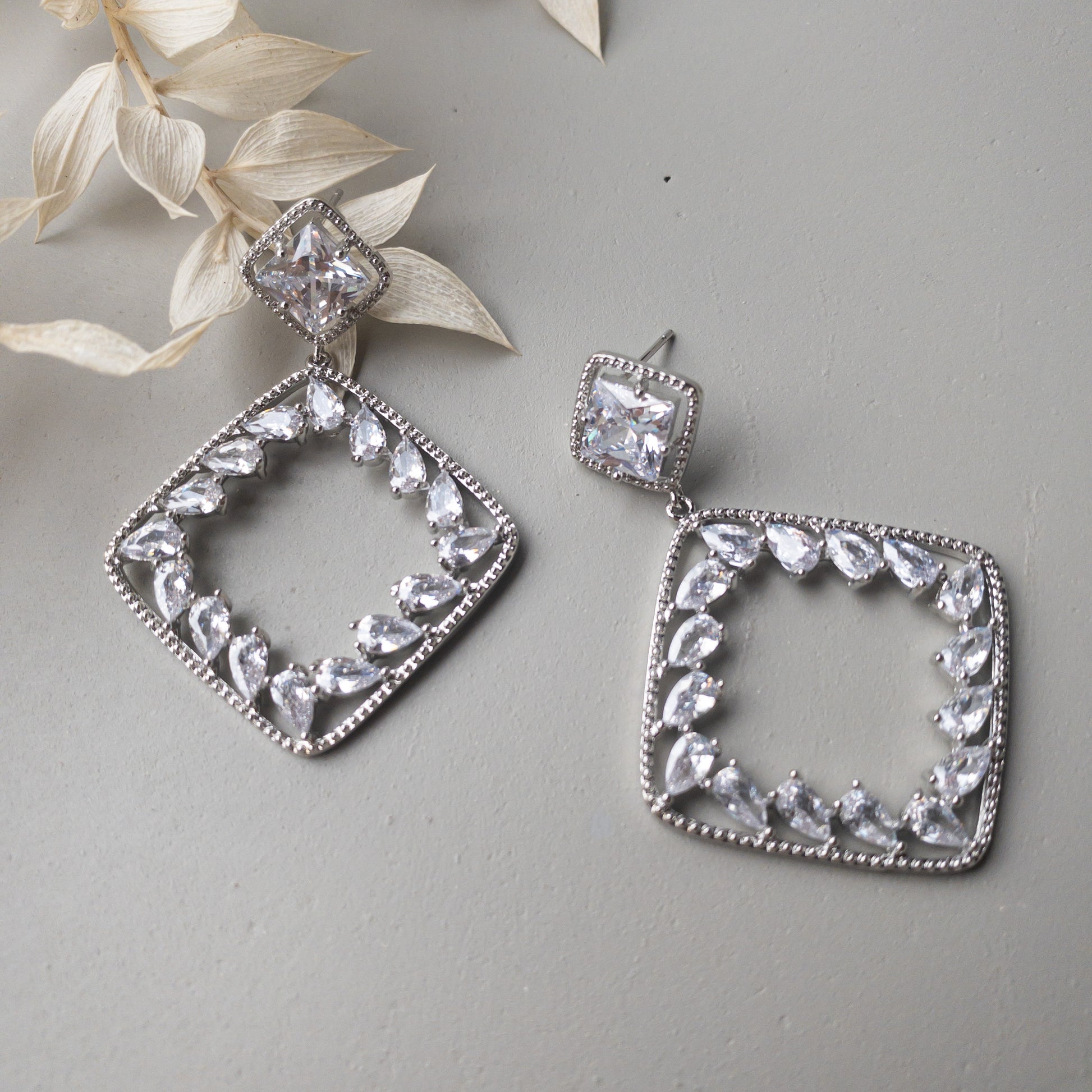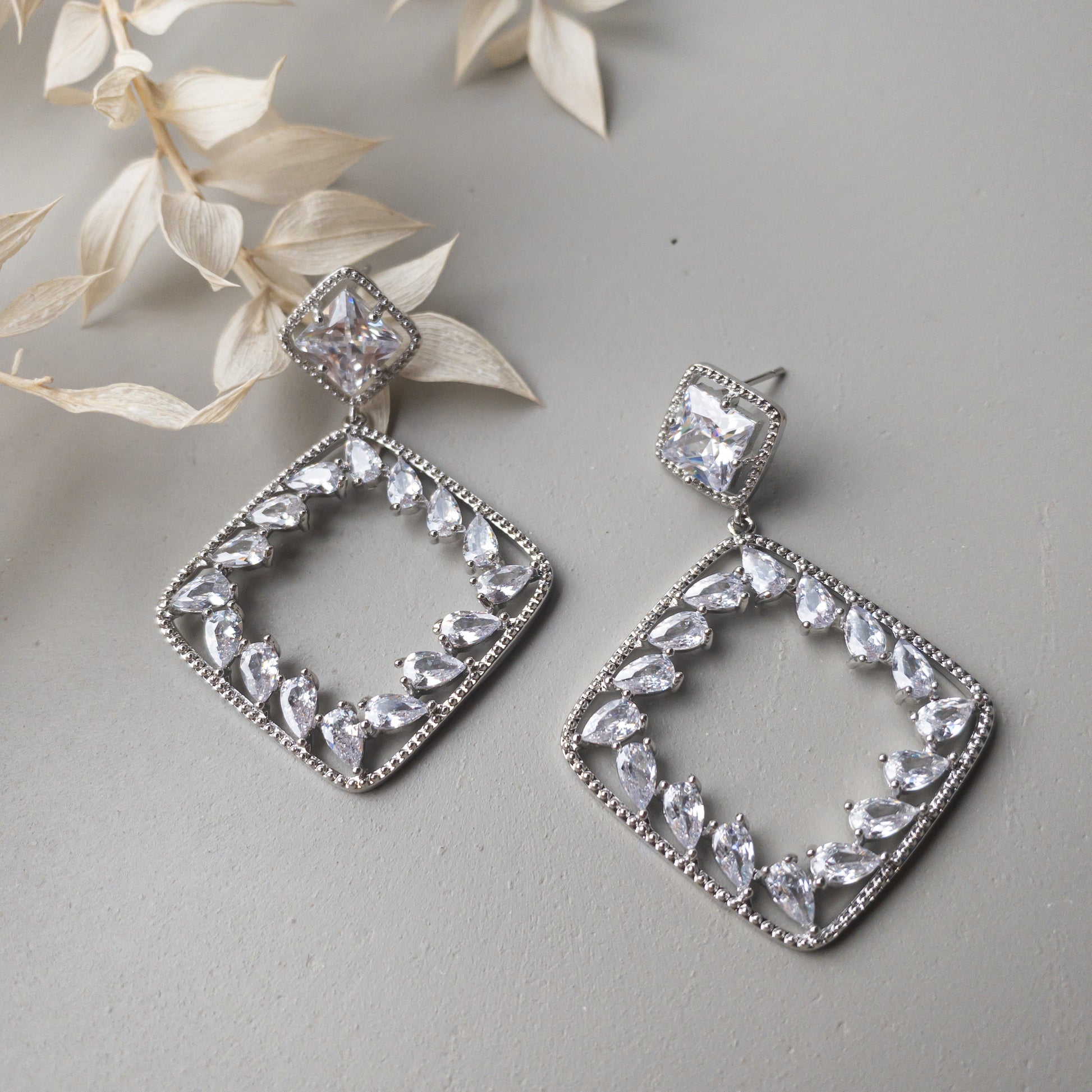 - Cercei fabricati din metal, placati cu rodiu, cu cristale de zirconiu aplicate.