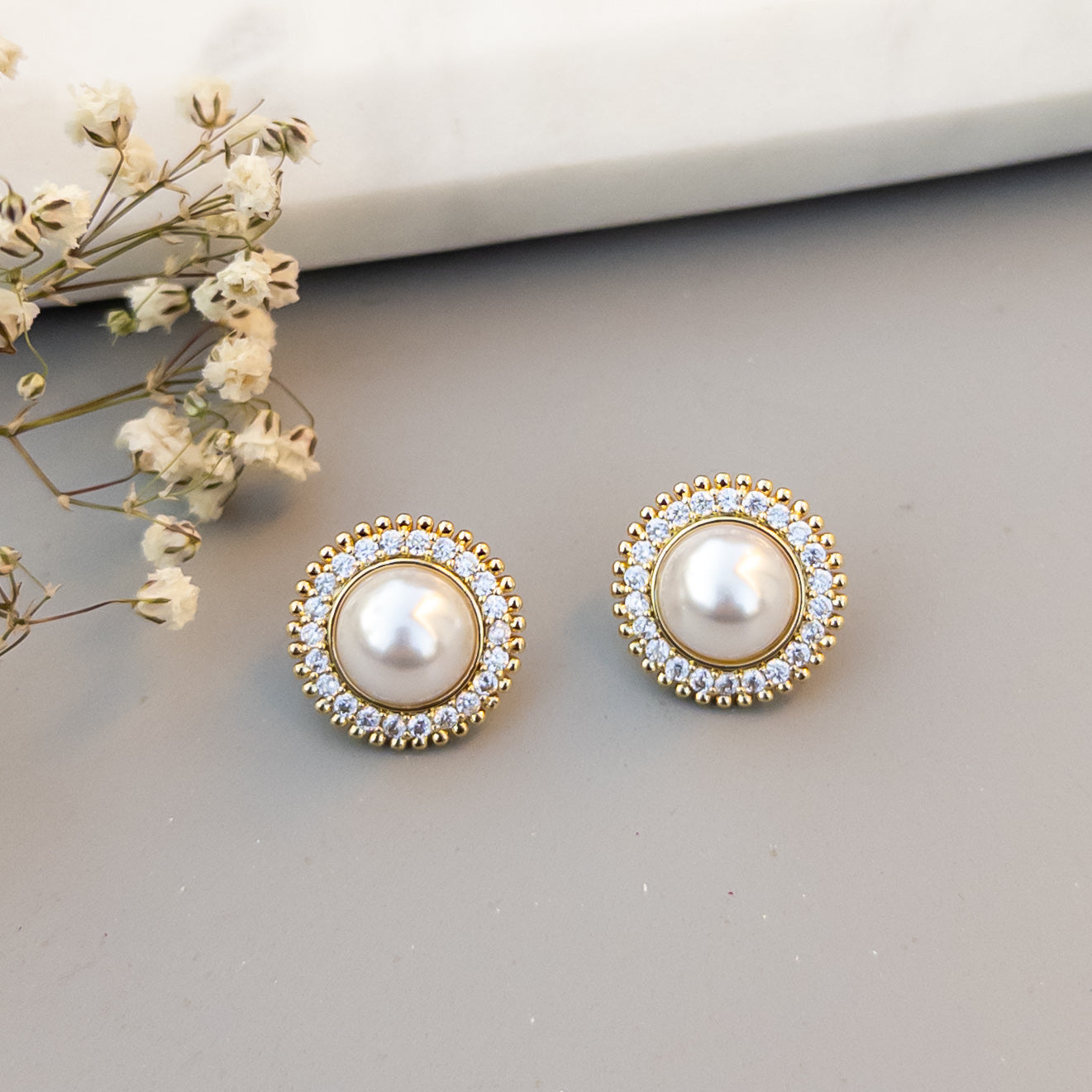 - Cercei fabricati din oțel inoxidabil, placati cu aur, cu cristale de zirconiu și perle aplicate.