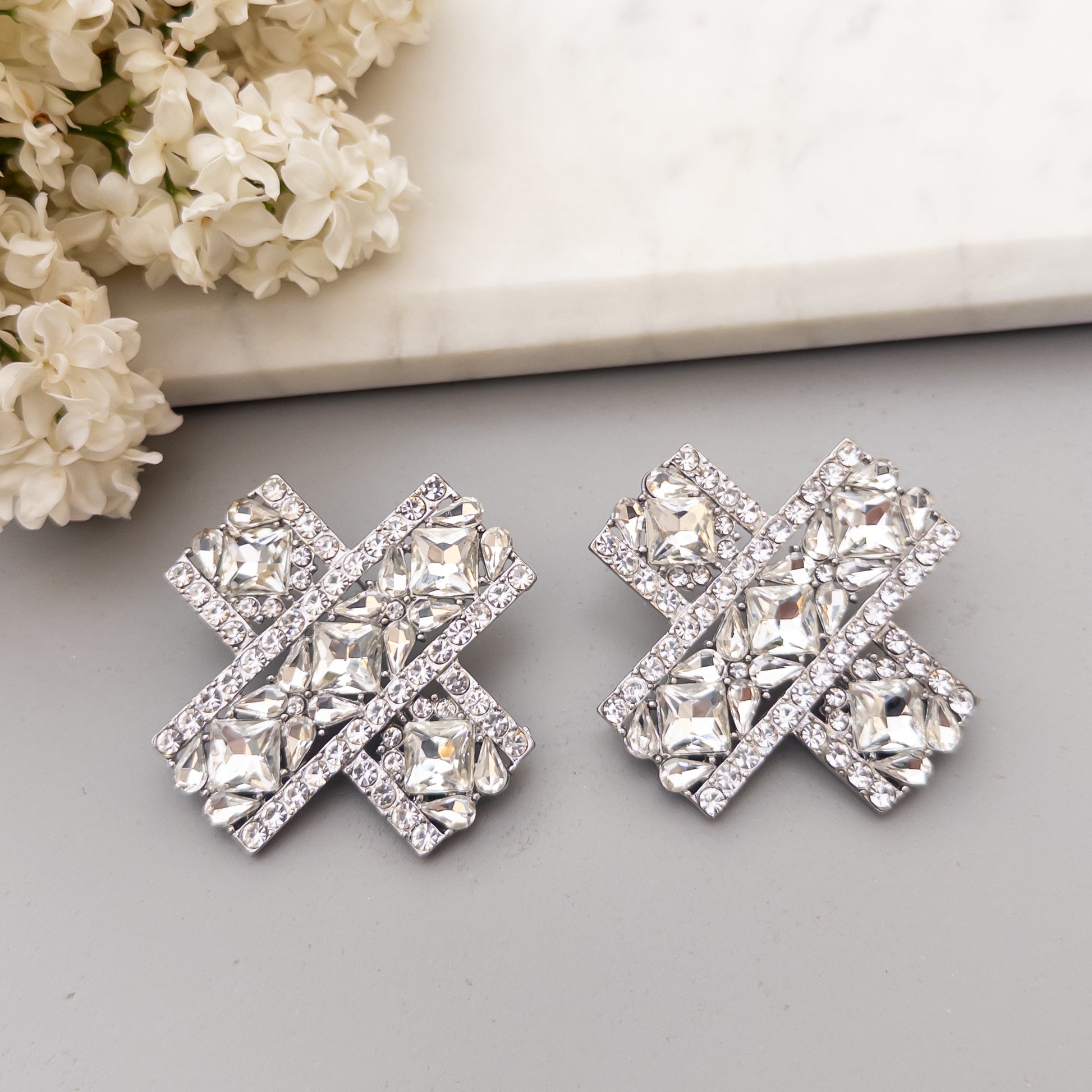- Cercei fabricati din metal, cu cristale de sticla aplicate.