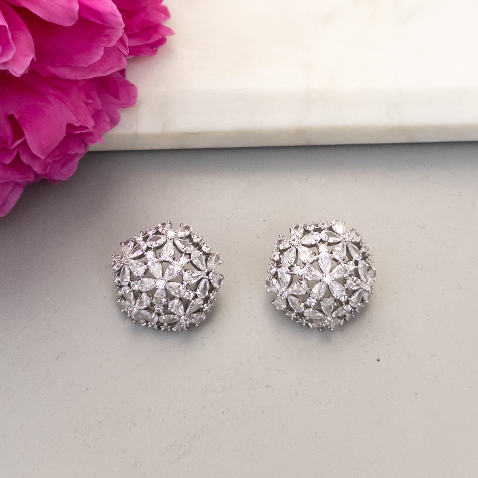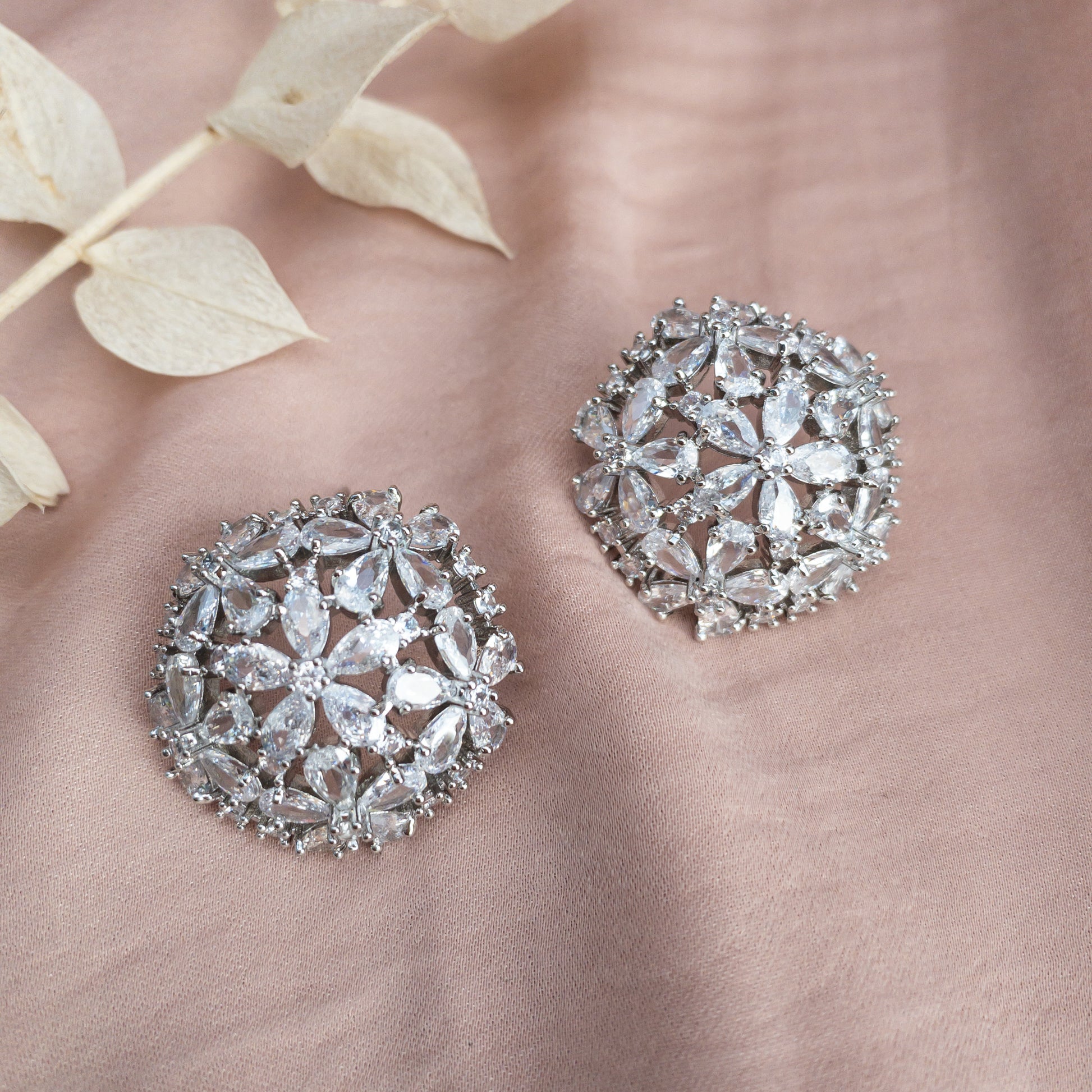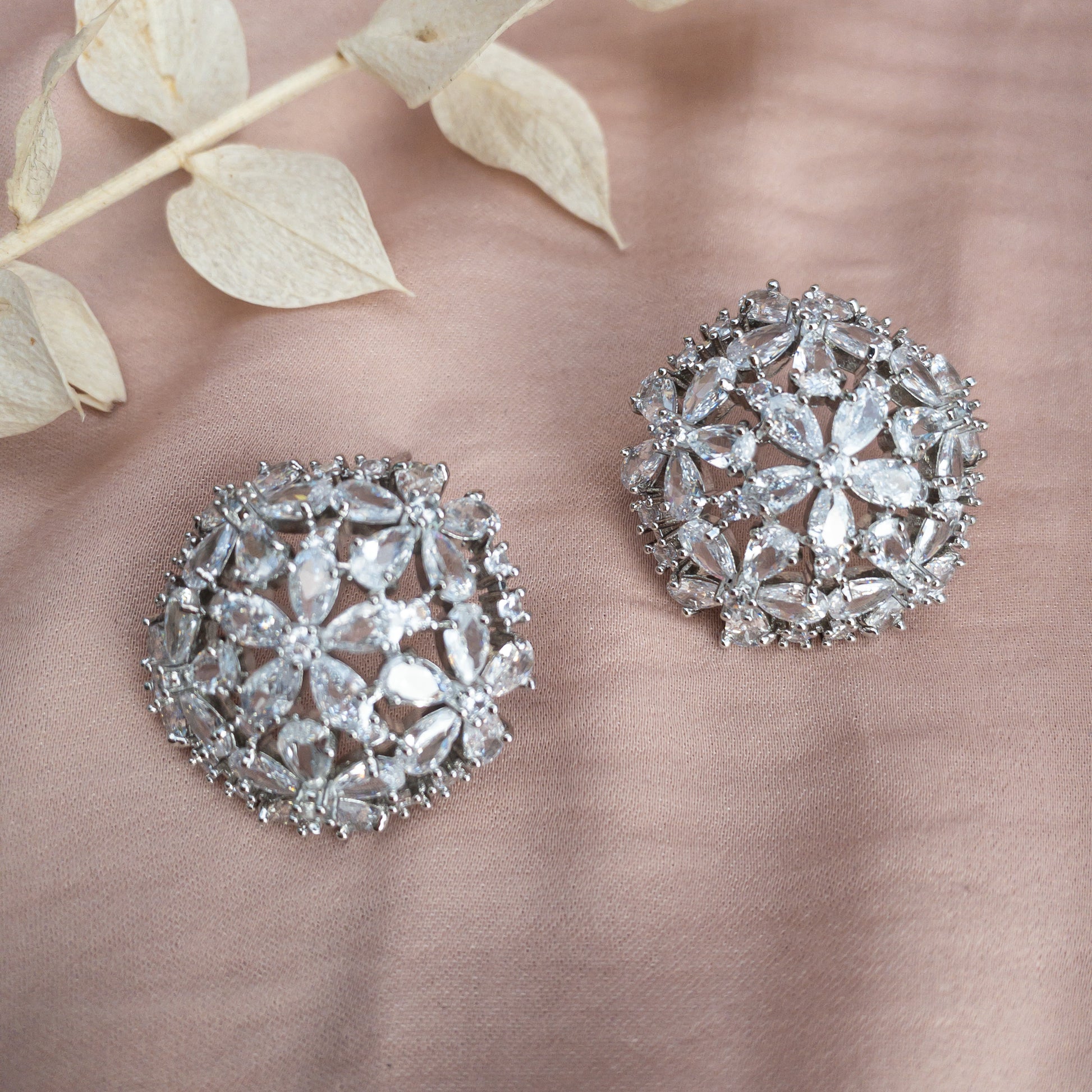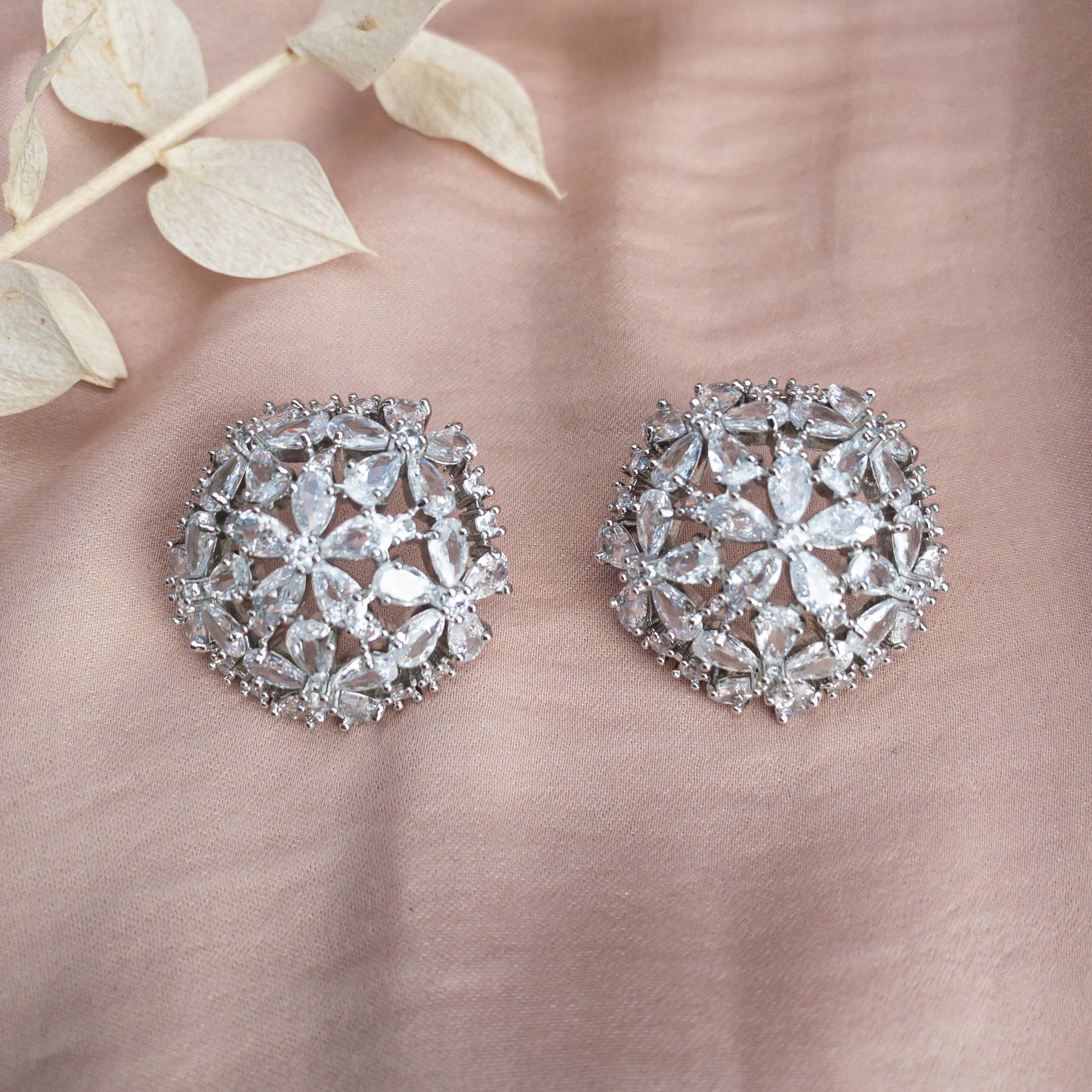 - Cercei fabricati din cupru, placati cu rodiu, cu cristale de zirconiu aplicate.