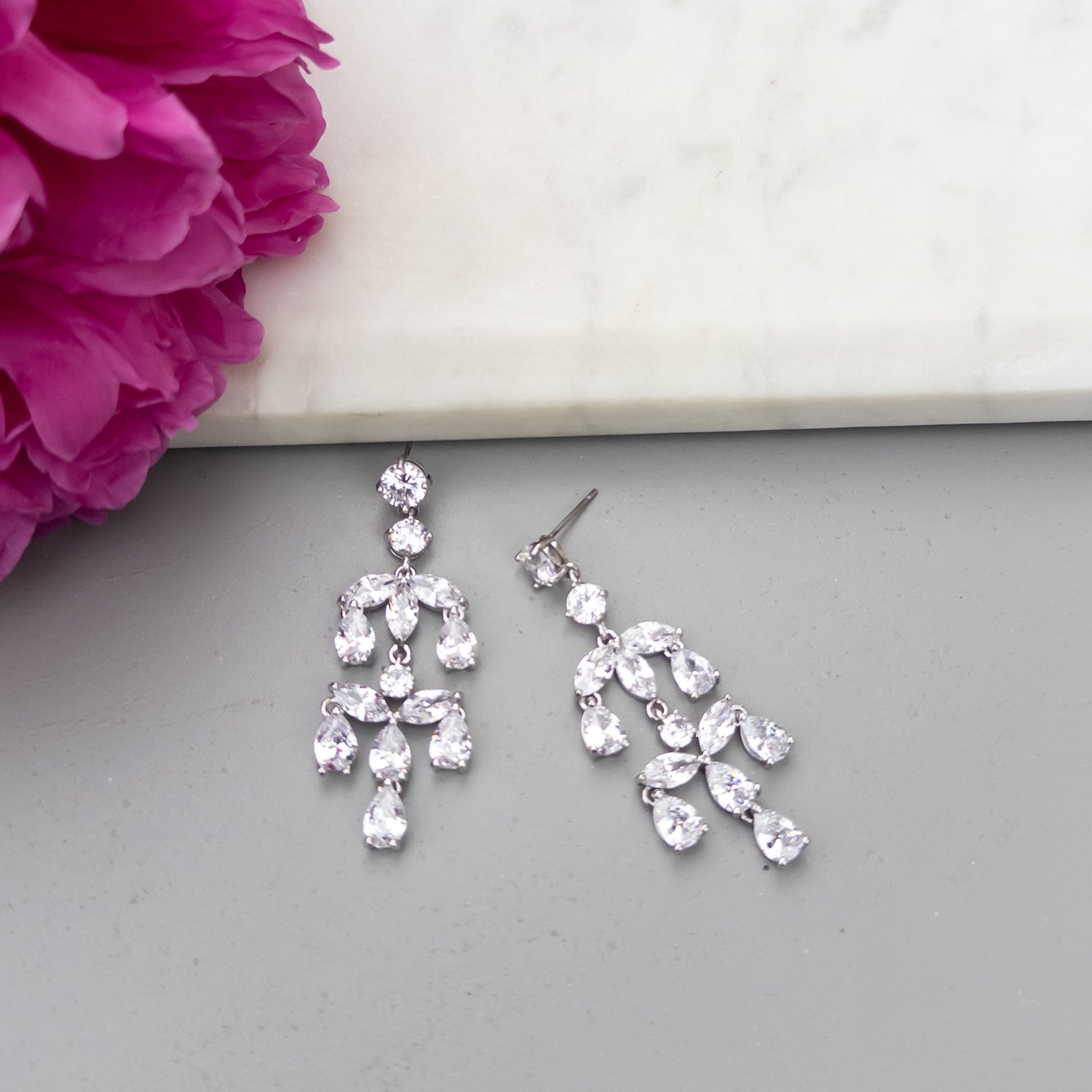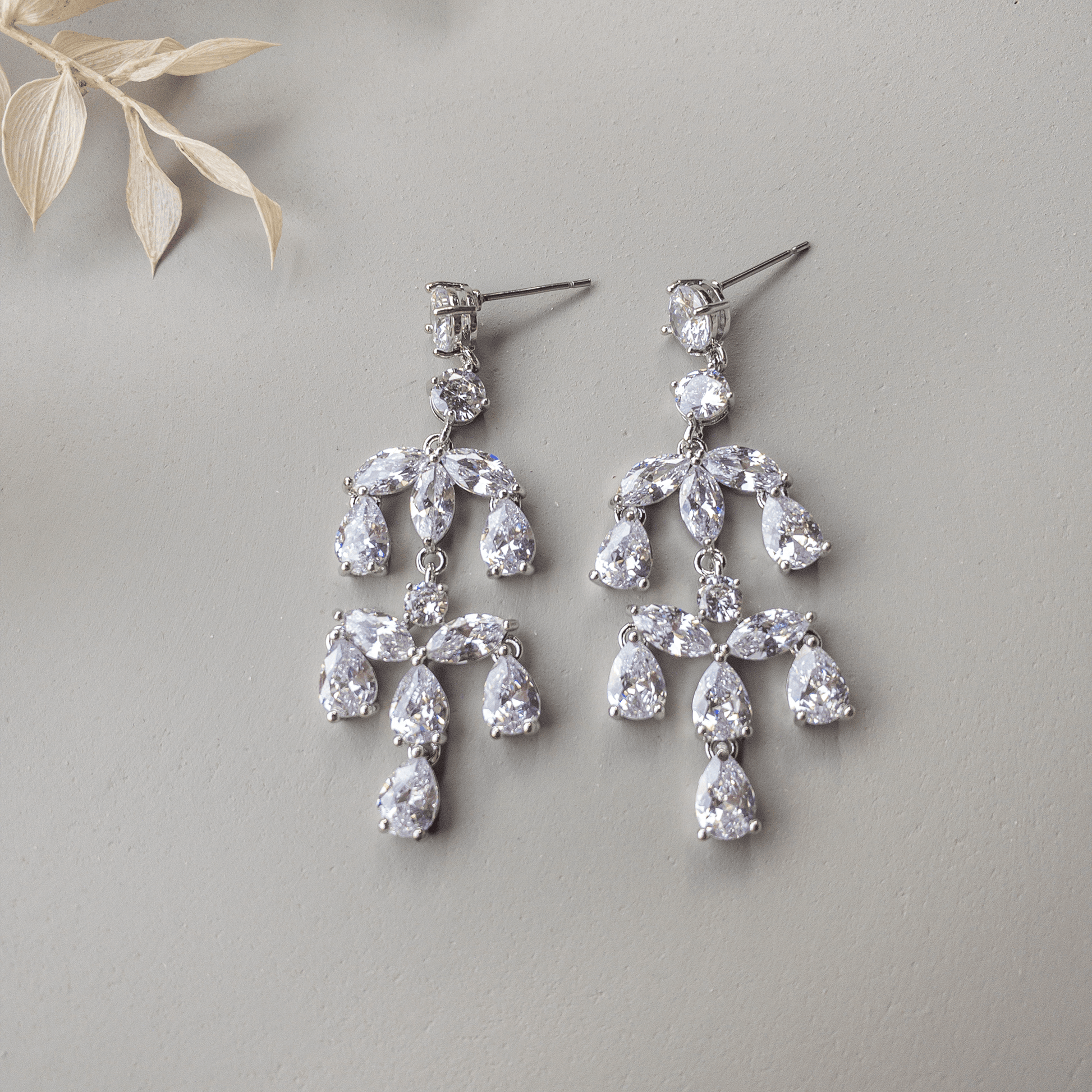 - Cercei fabricati din cupru, placat cu rodiu, cu cristale de zirconiu aplicate.