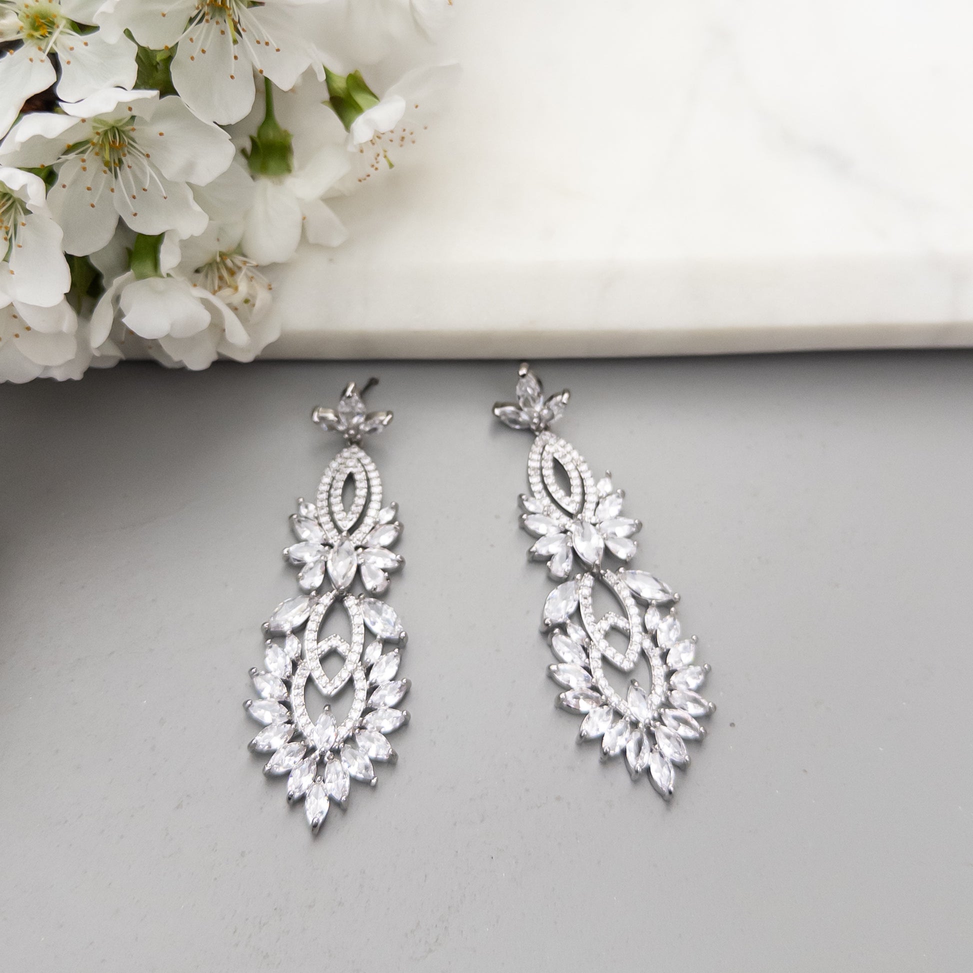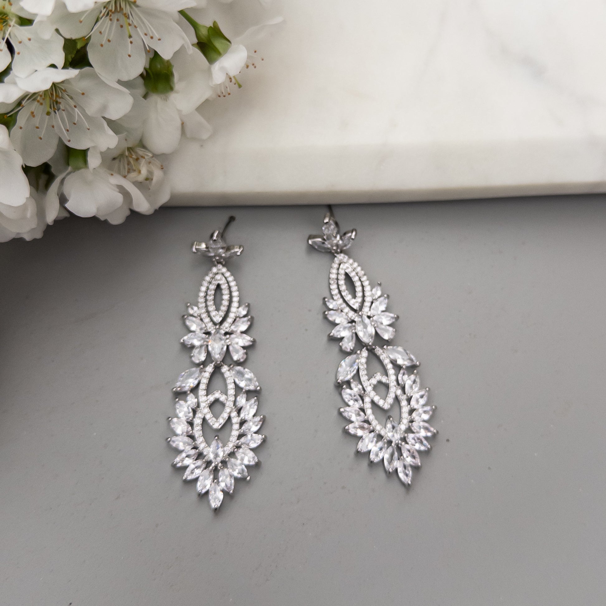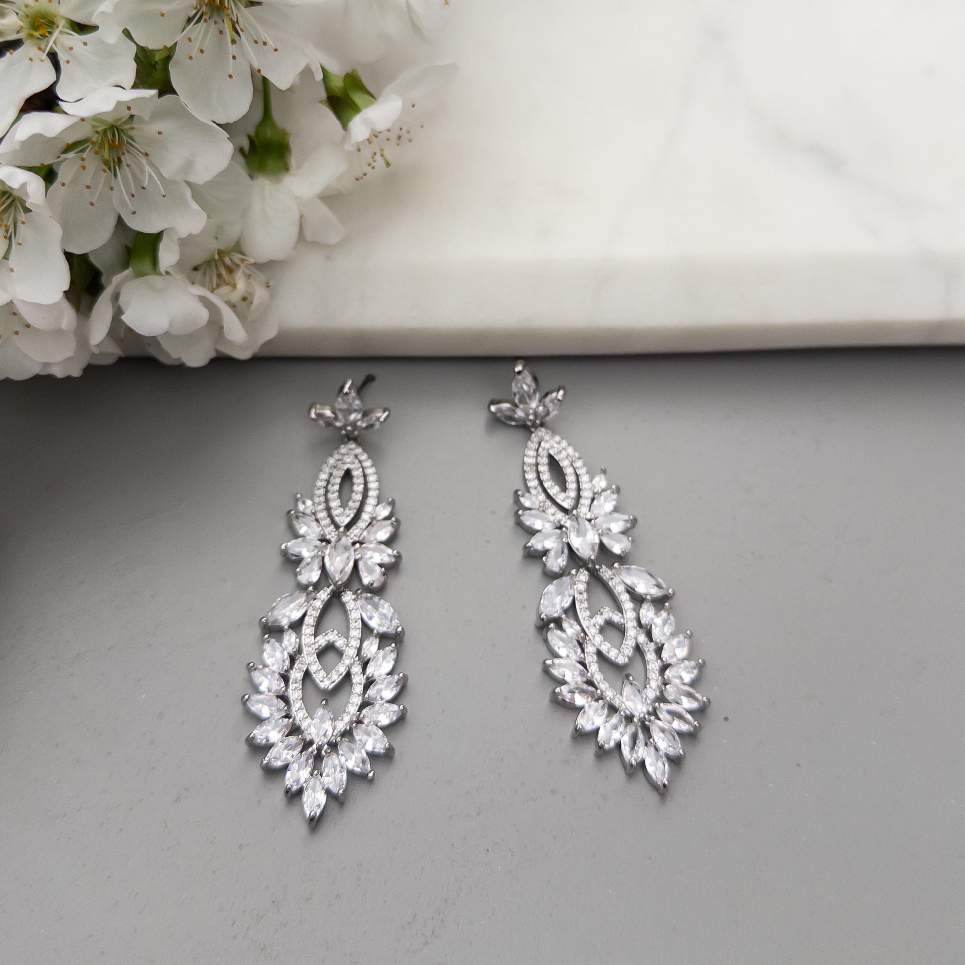 - Cercei fabricati din otel inoxidabil, placati cu rodiu, cu cristale de zirconiu aplicate.
