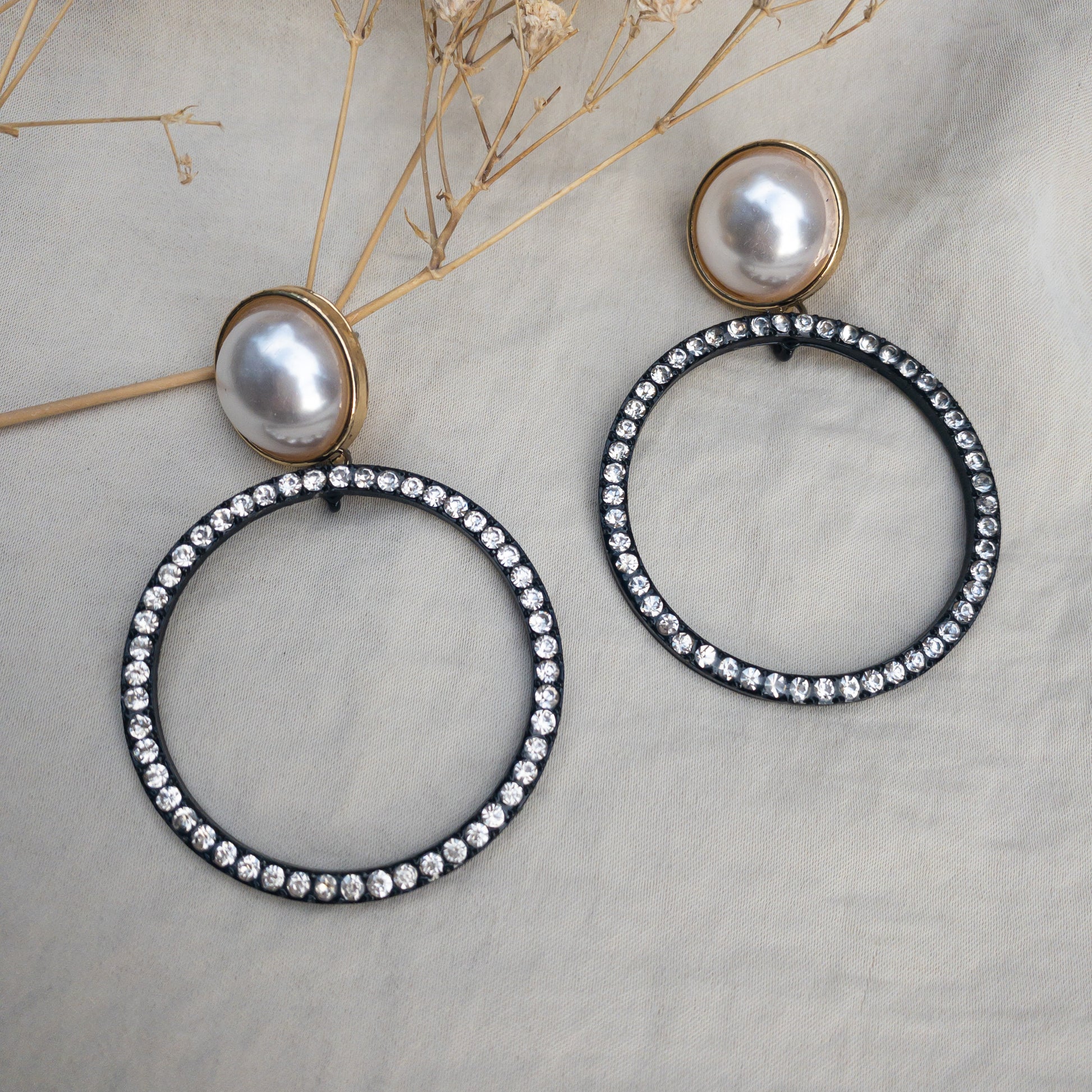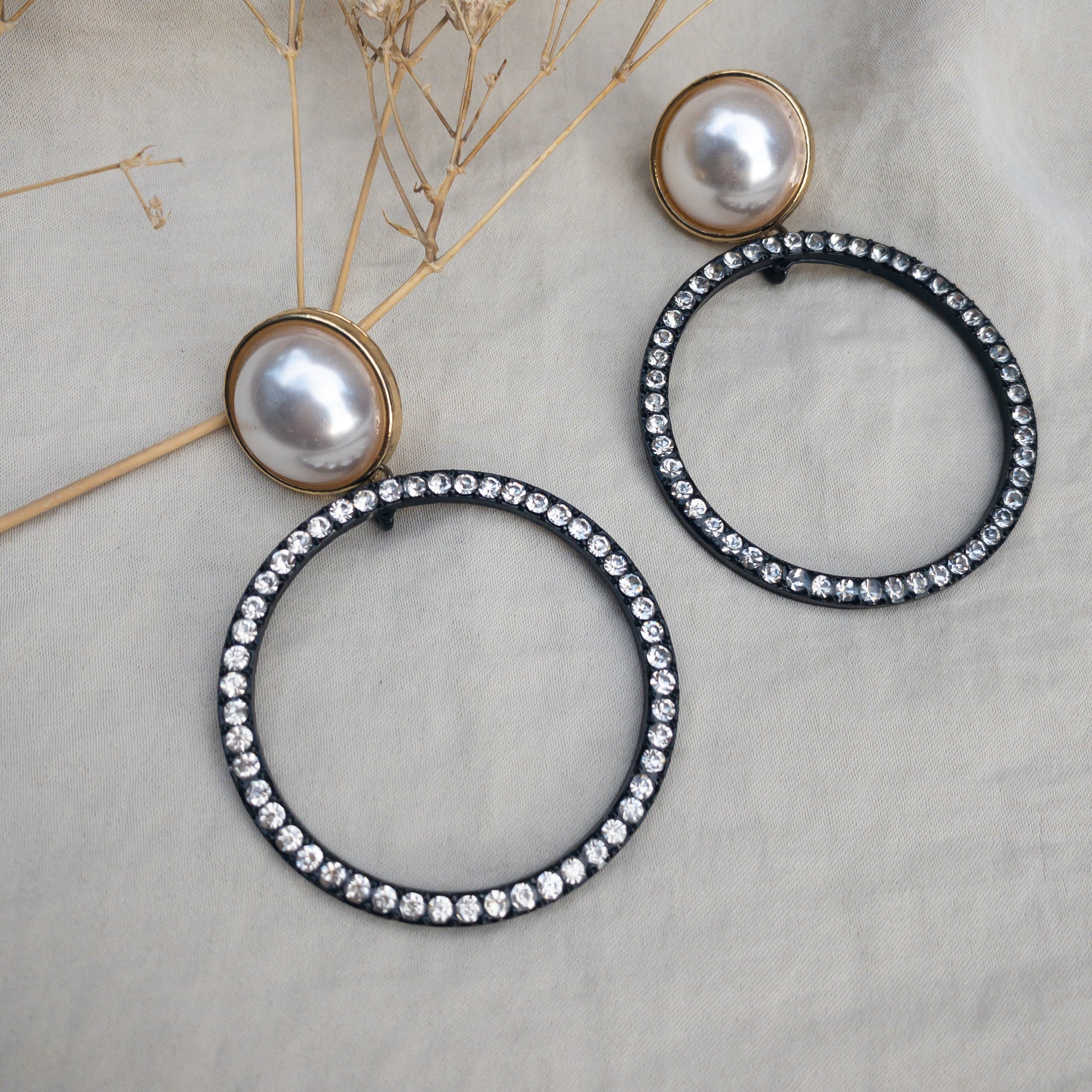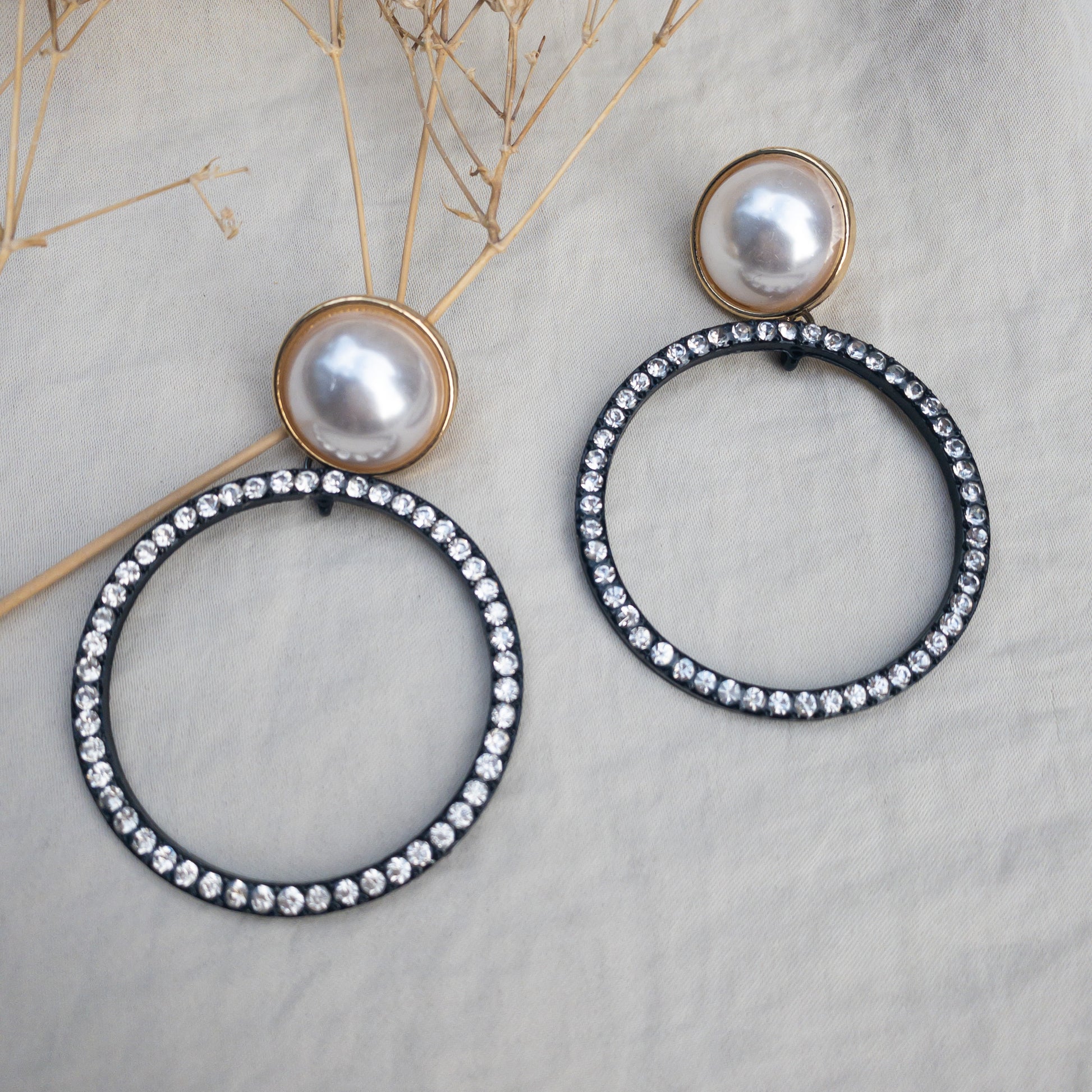 - Cercei fabricati din metal, cu cristale de sticla și perle sintetice aplicate.