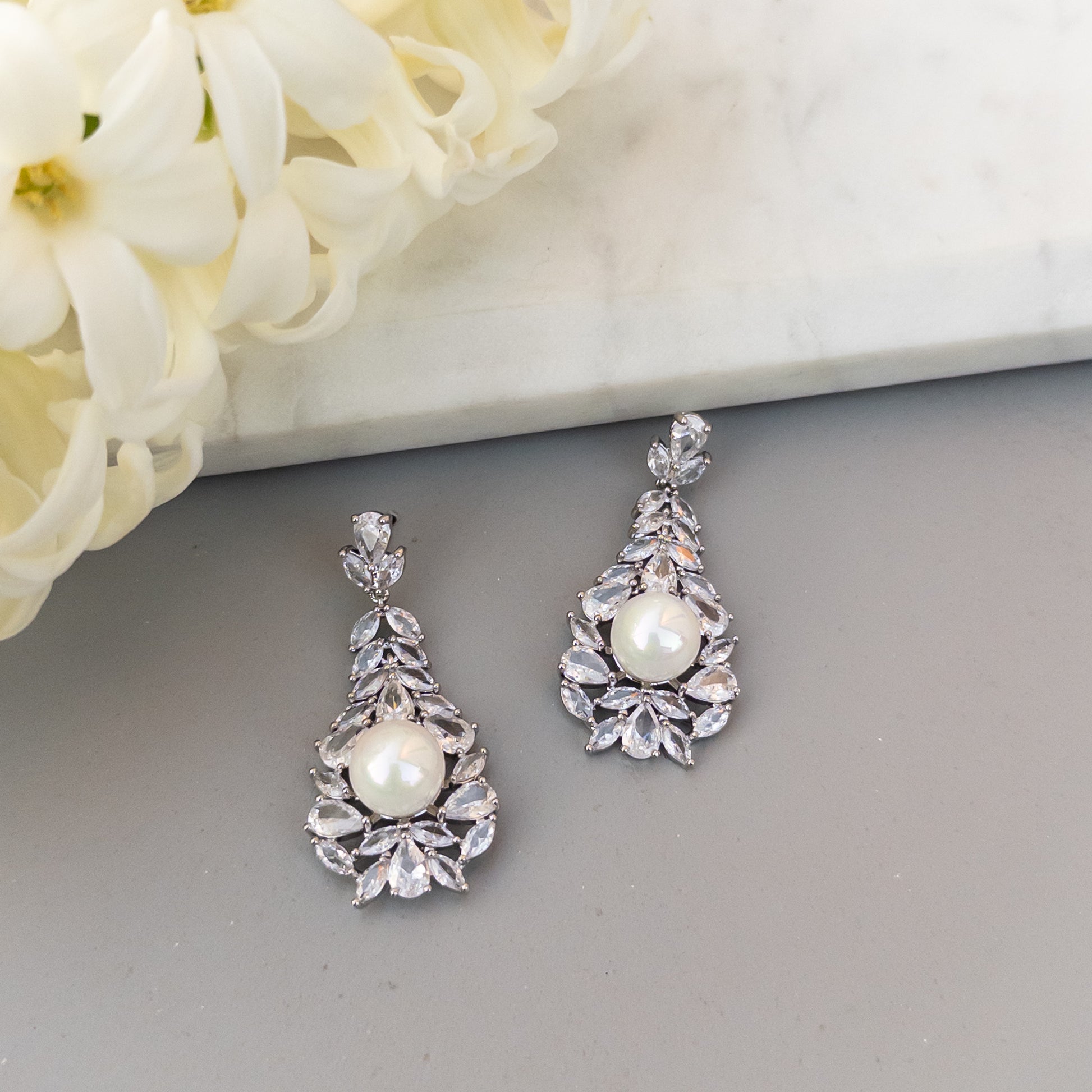 - Cercei fabricati din otel inoxidabil, placati cu rodiu, cu cristale de zirconiu si perle aplicate.