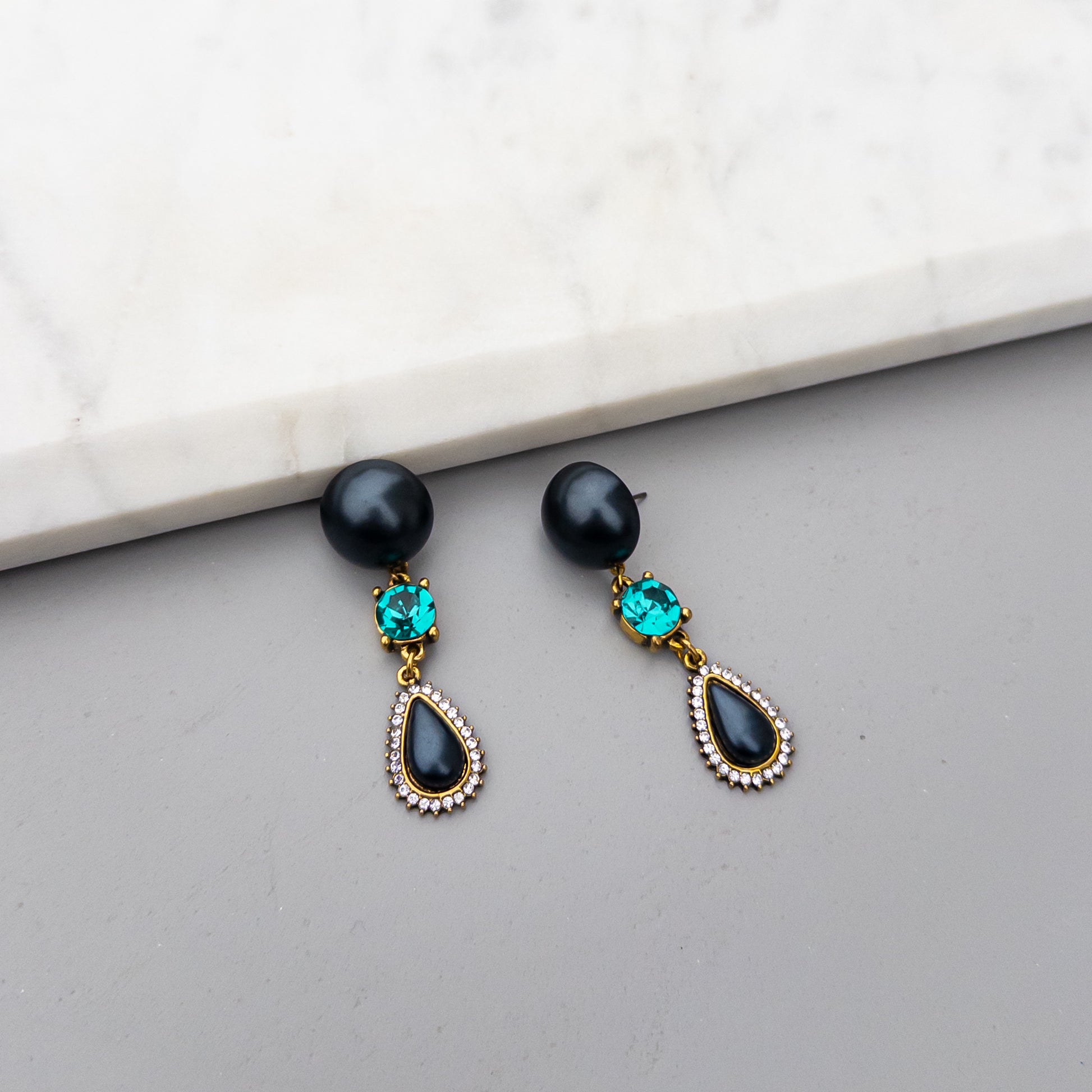 - Cercei fabricati din metal, cu cristale de sticla și perle aplicate.
