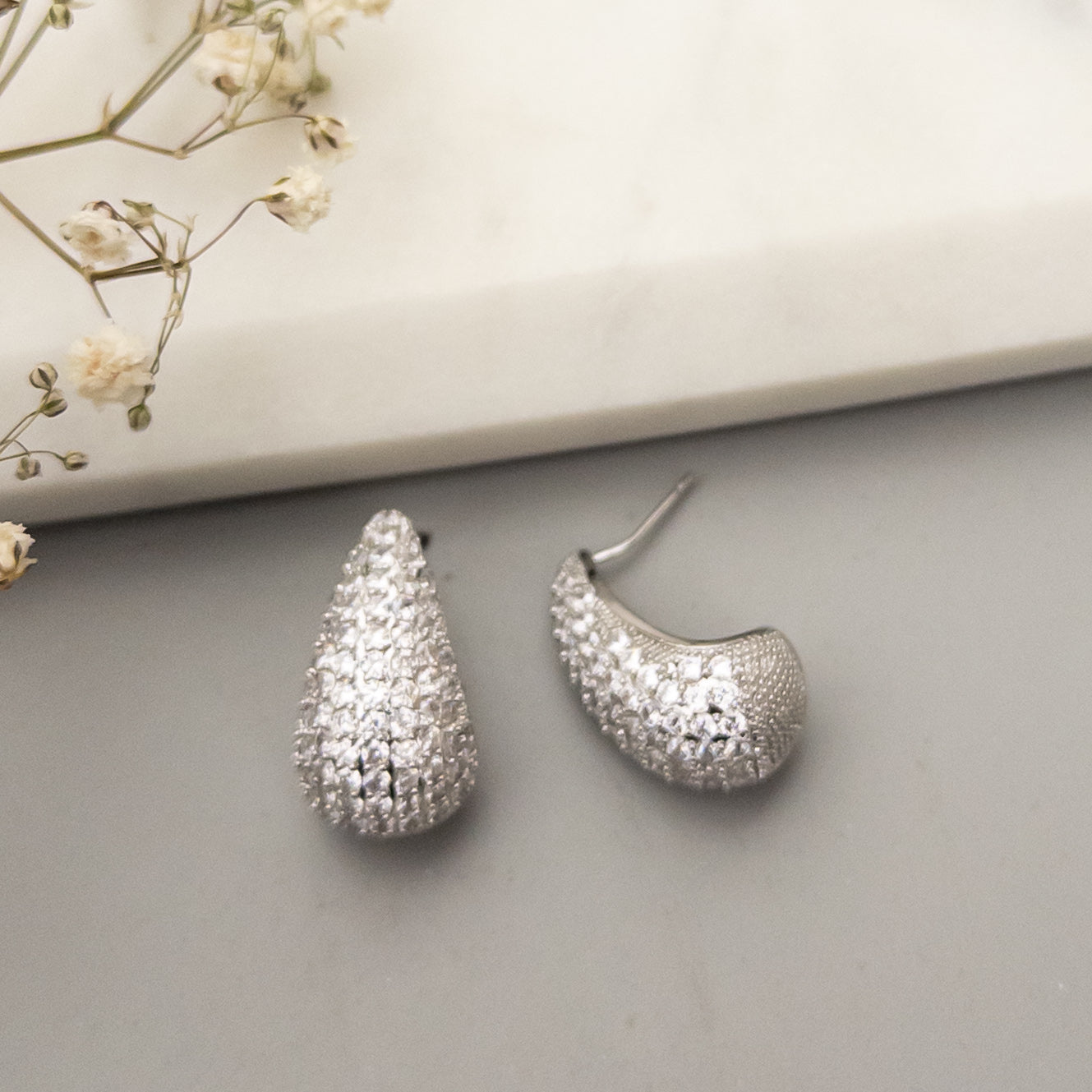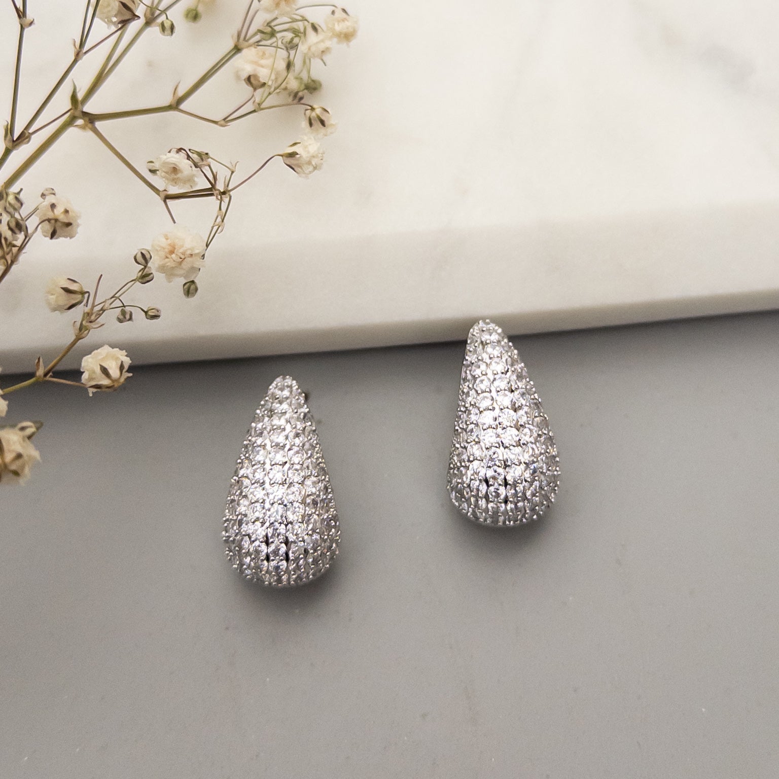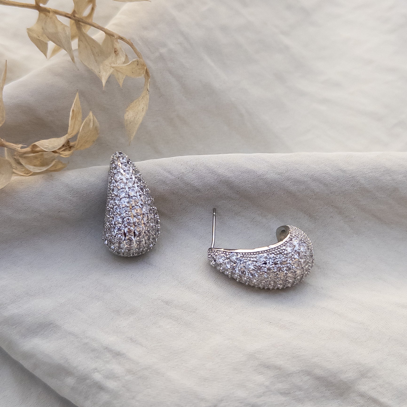 - Cercei fabricati din otel inoxidabil, placat cu rodiu, cu cristale de zirconiu aplicate.