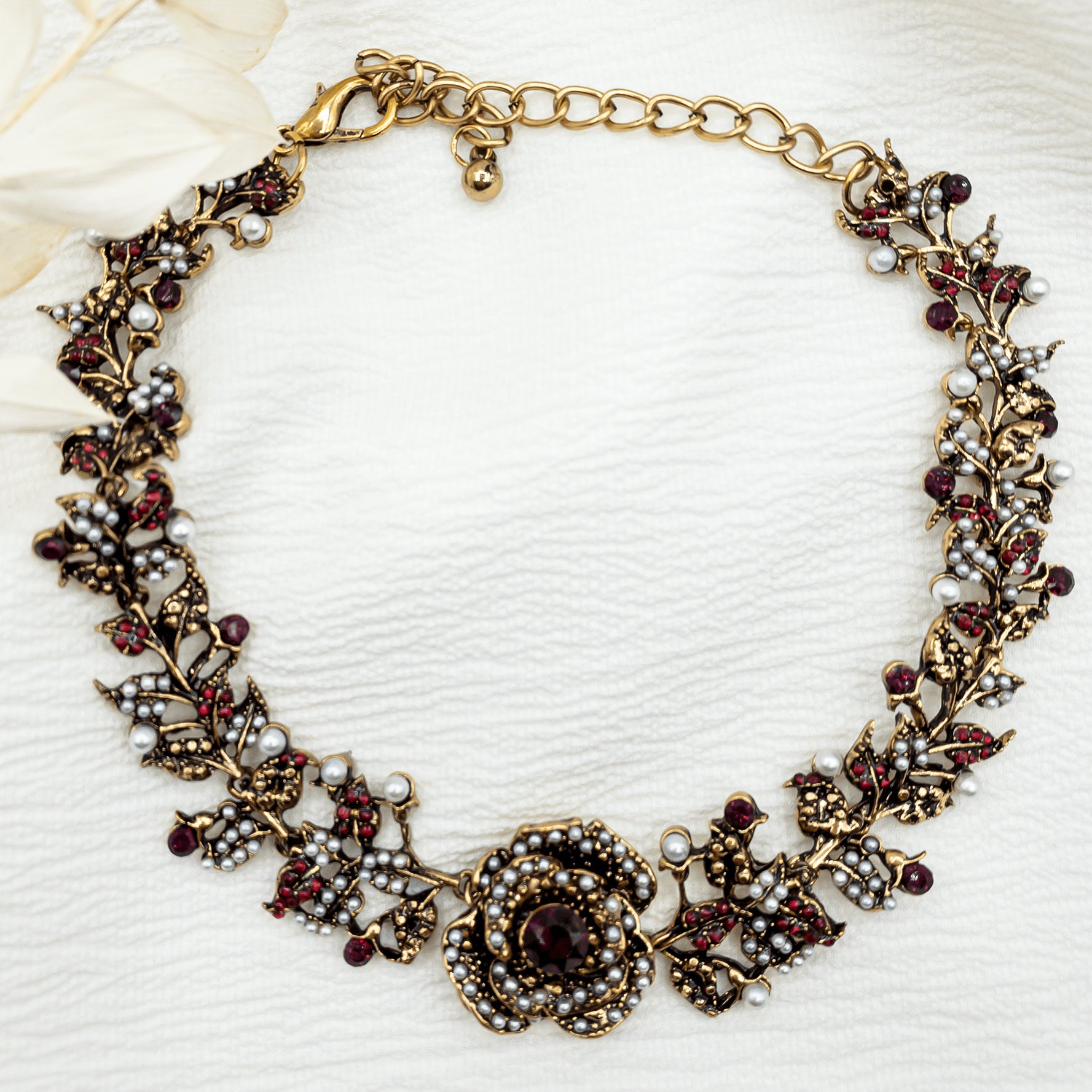 - Colier fabricat din metal, cu cristale de sticla și perle aplicate.