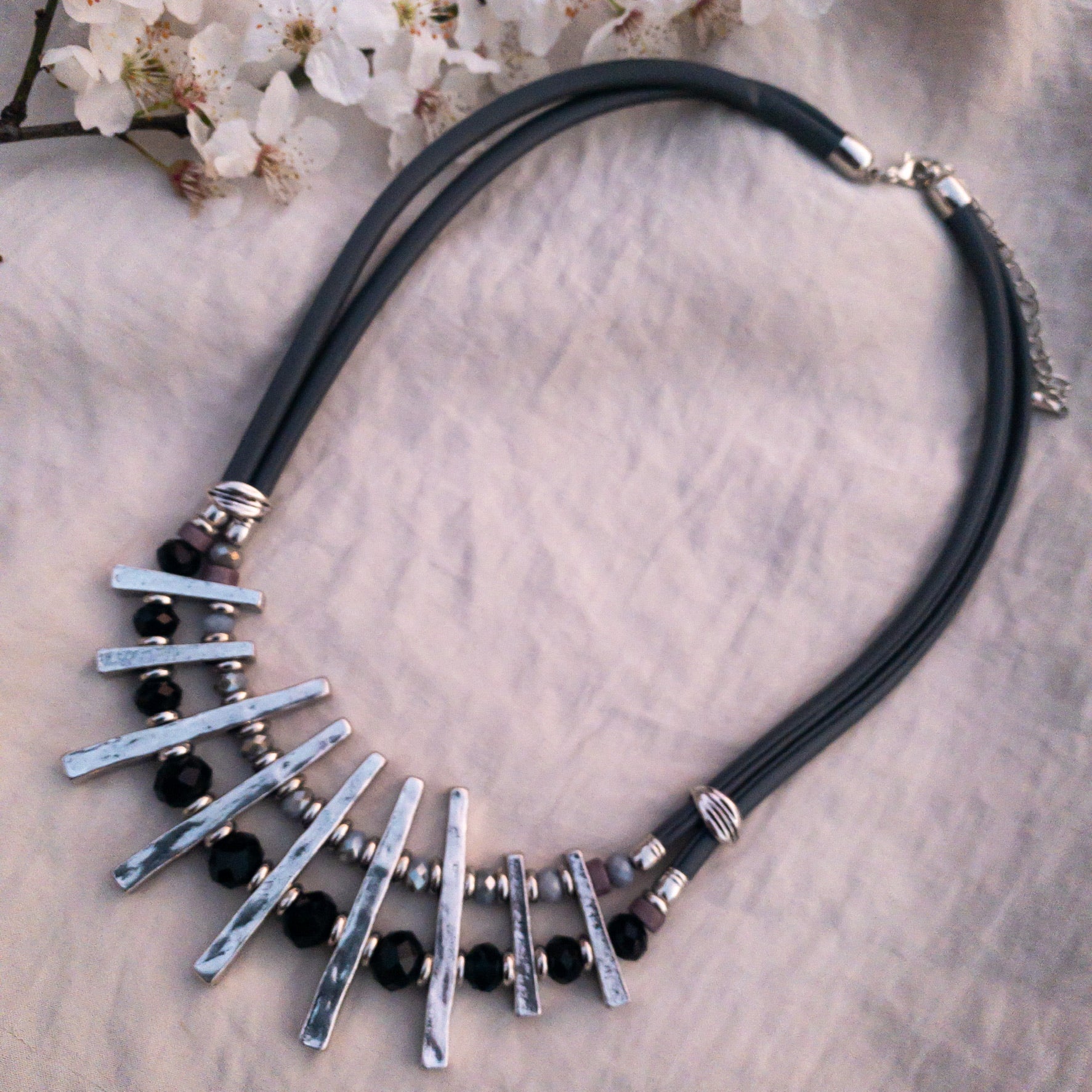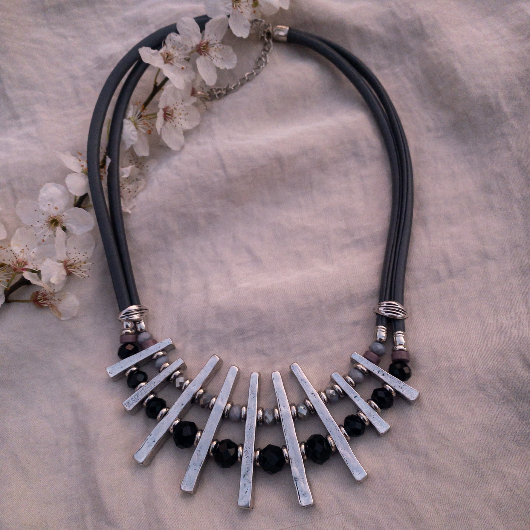 - Colier fabricat din metal, material sintetic si cristale sticla.