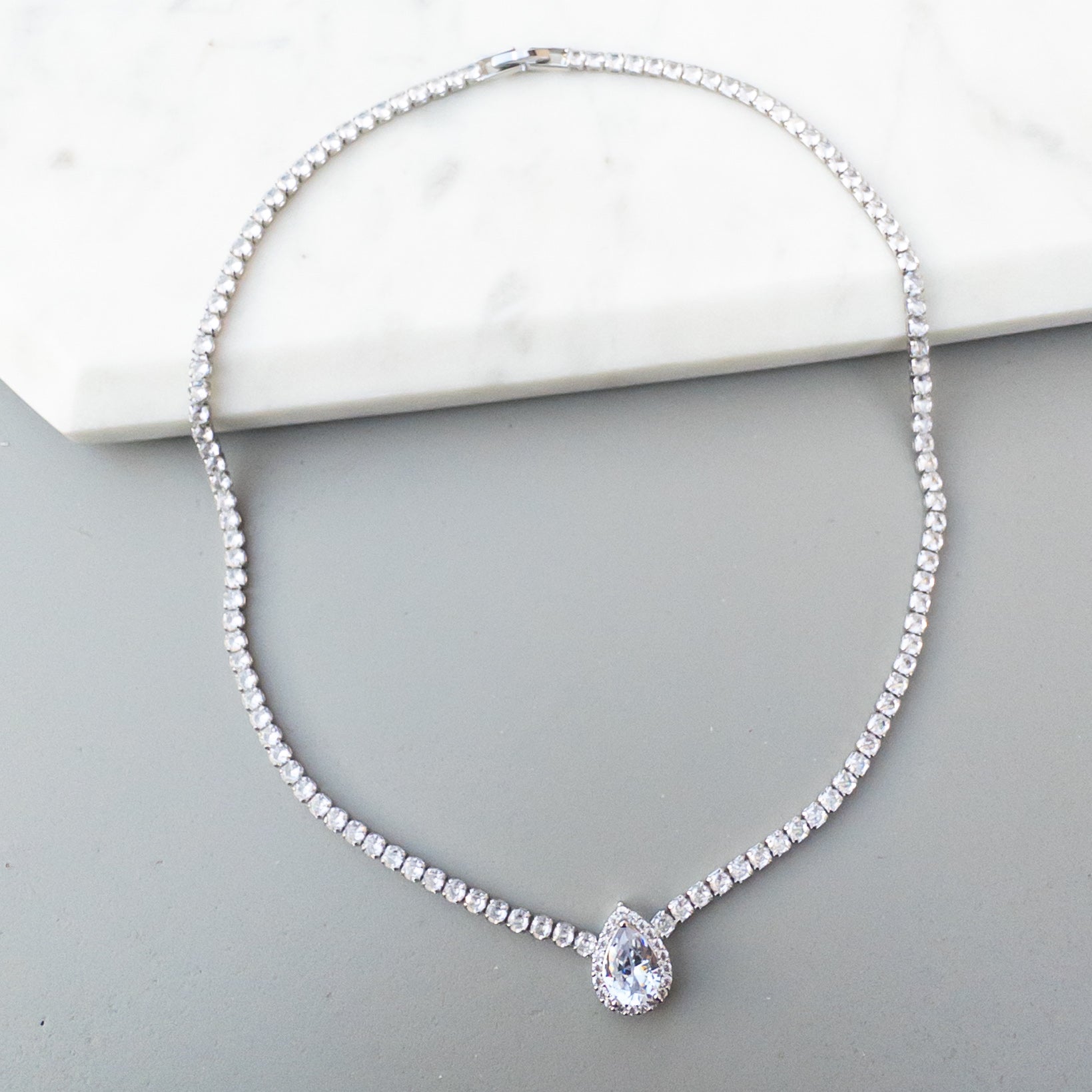 - Colier fabricat din oțel inoxidabil, placat cu rodiu, cu cristale de zirconiu aplicate.