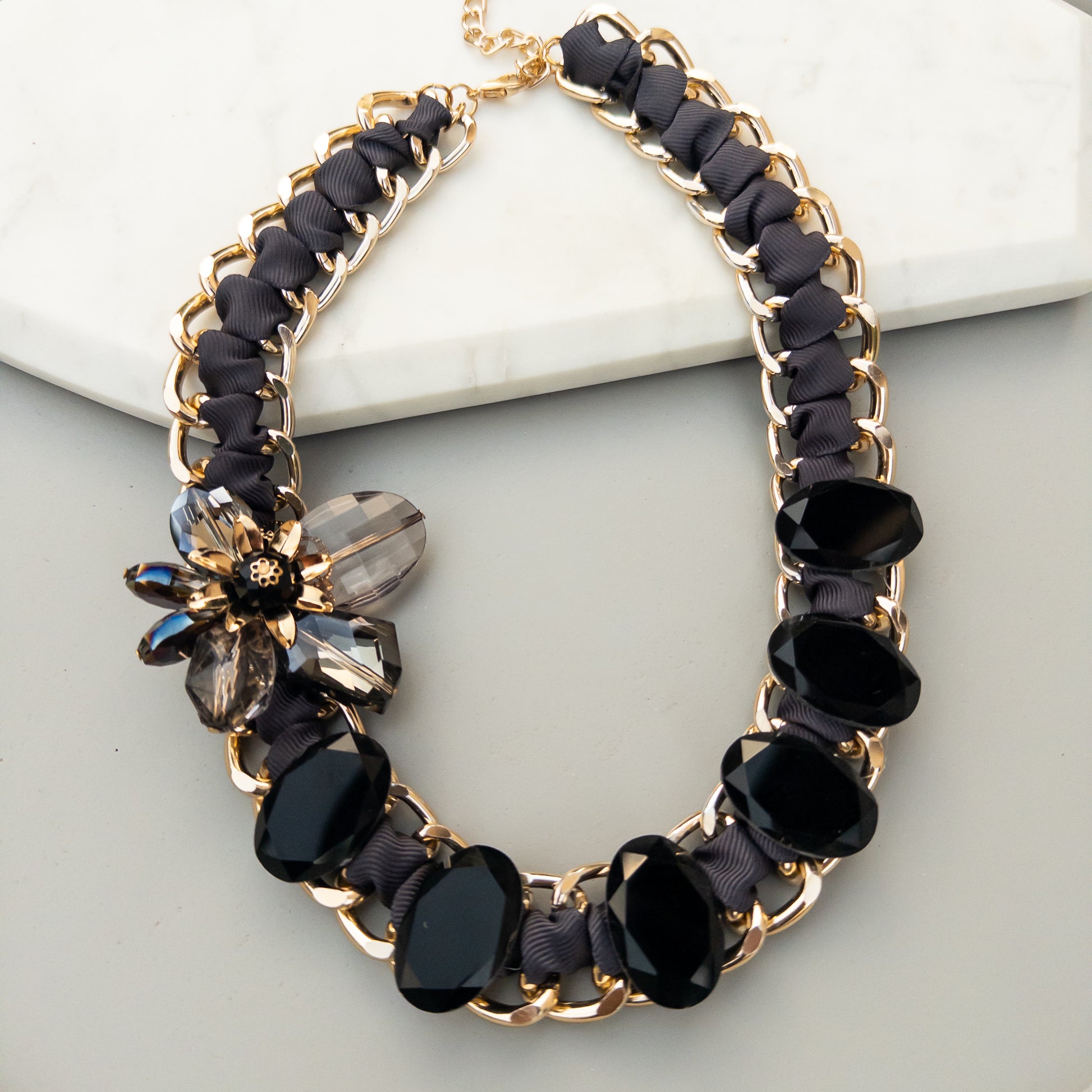 - Colier fabricat din metal, material textil și cristale de sticla aplicate.