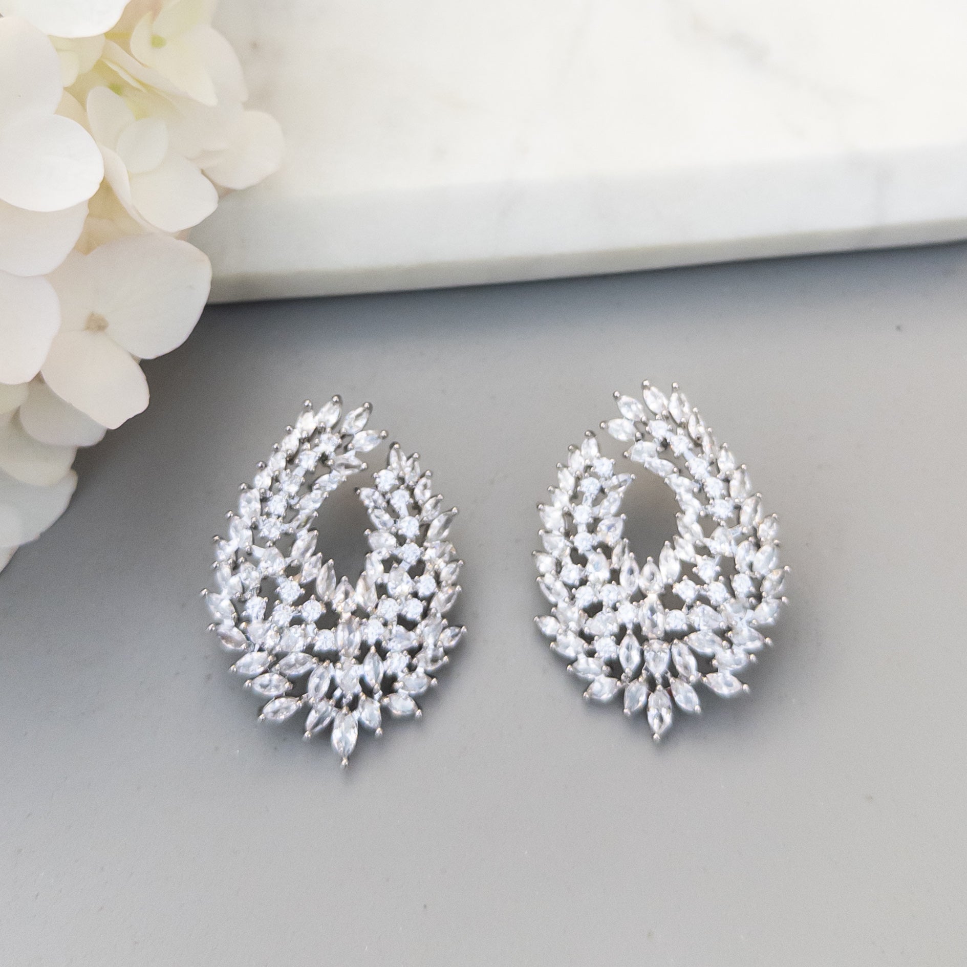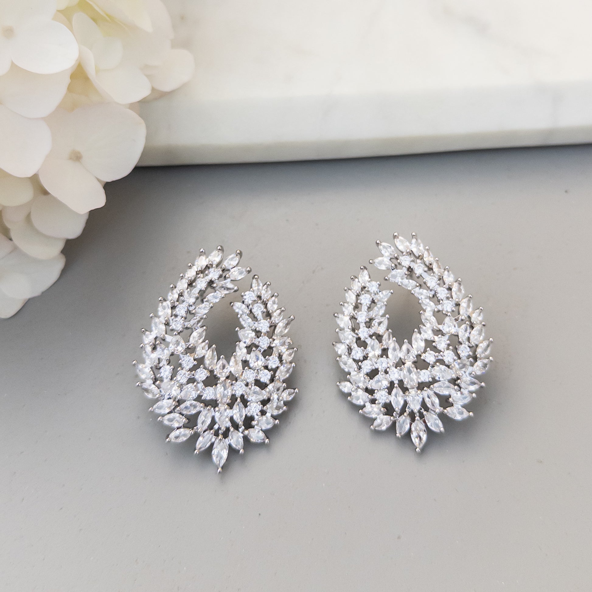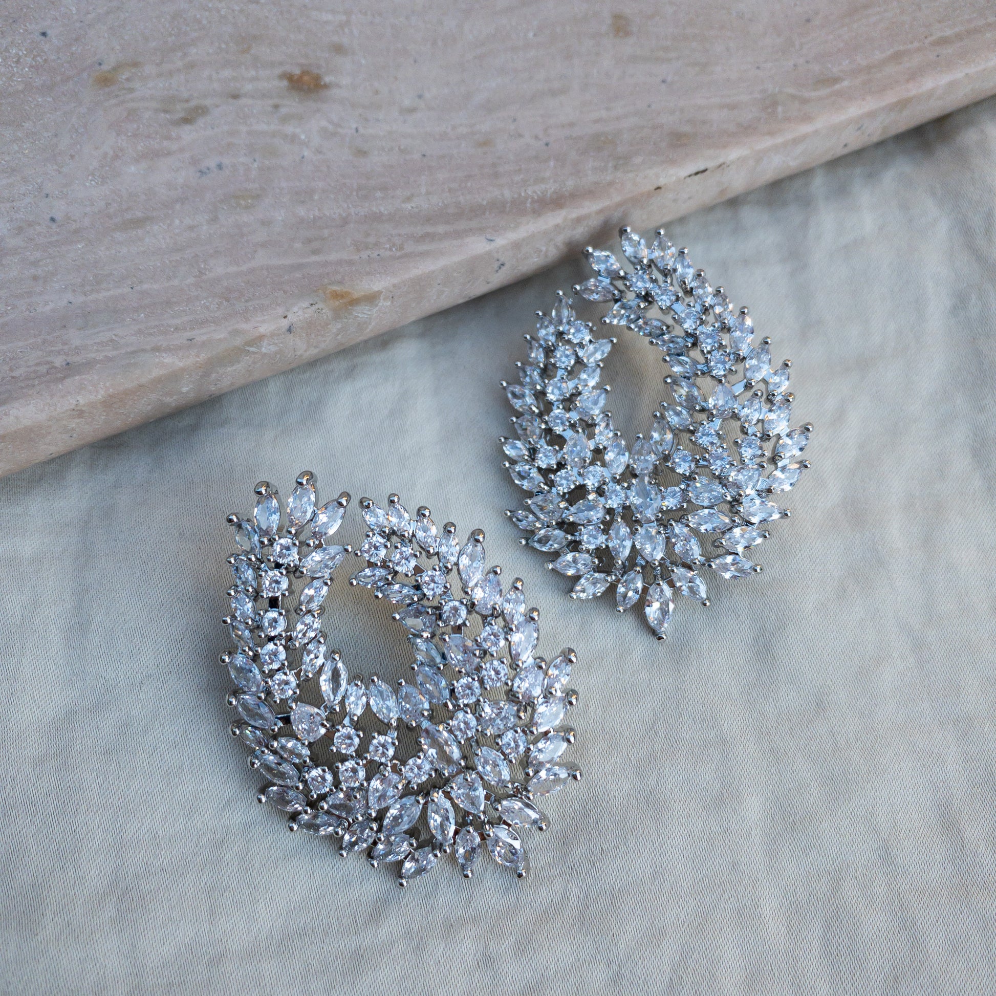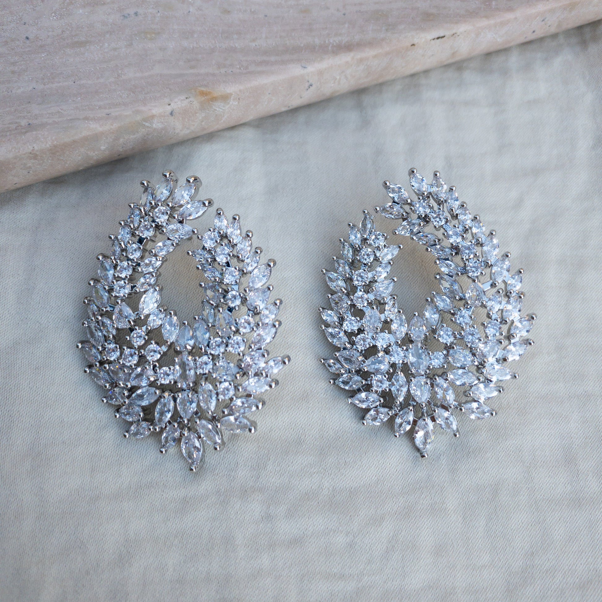 - Cercei fabricati din cupru, placati cu rodiu, cu cristale de zirconiu aplicate.