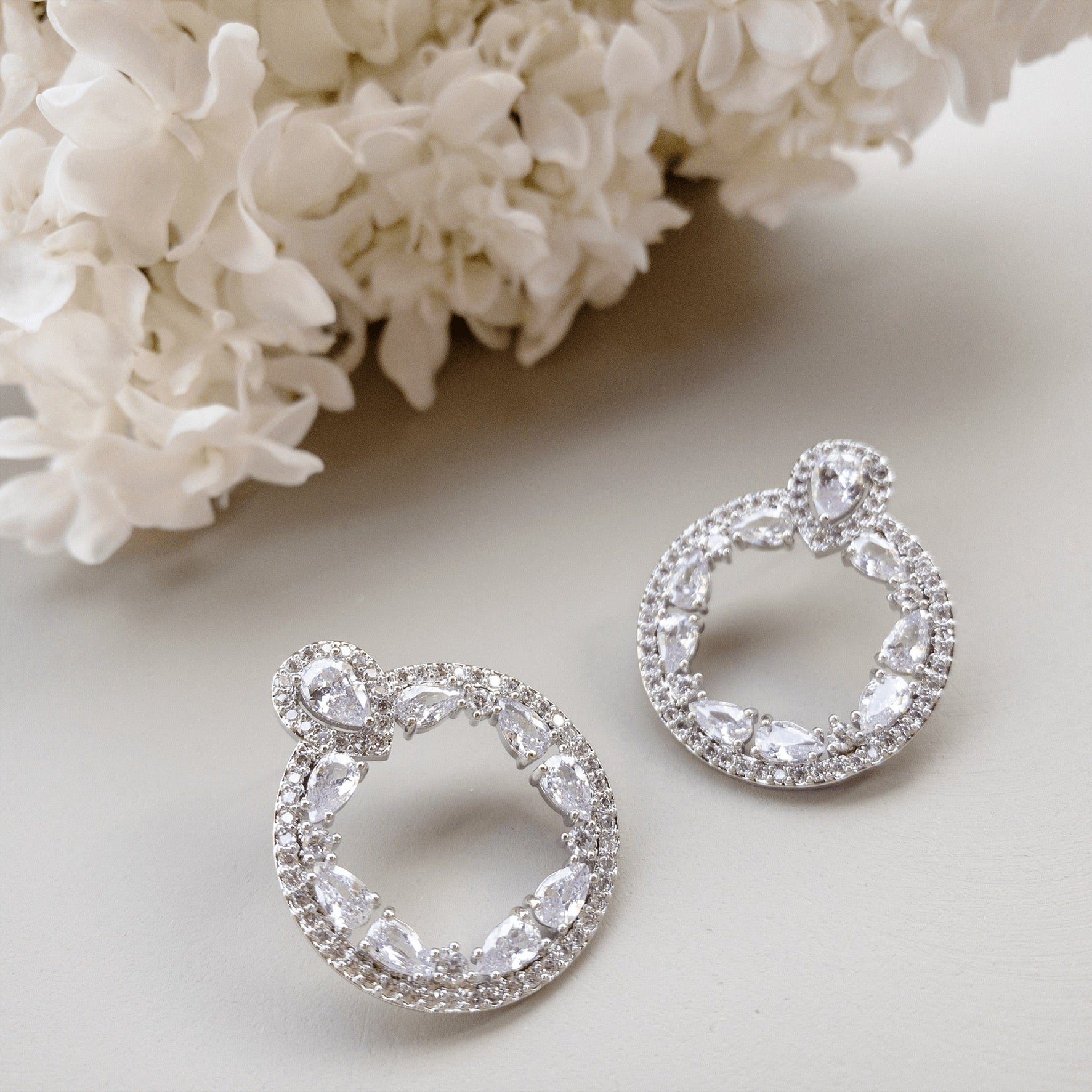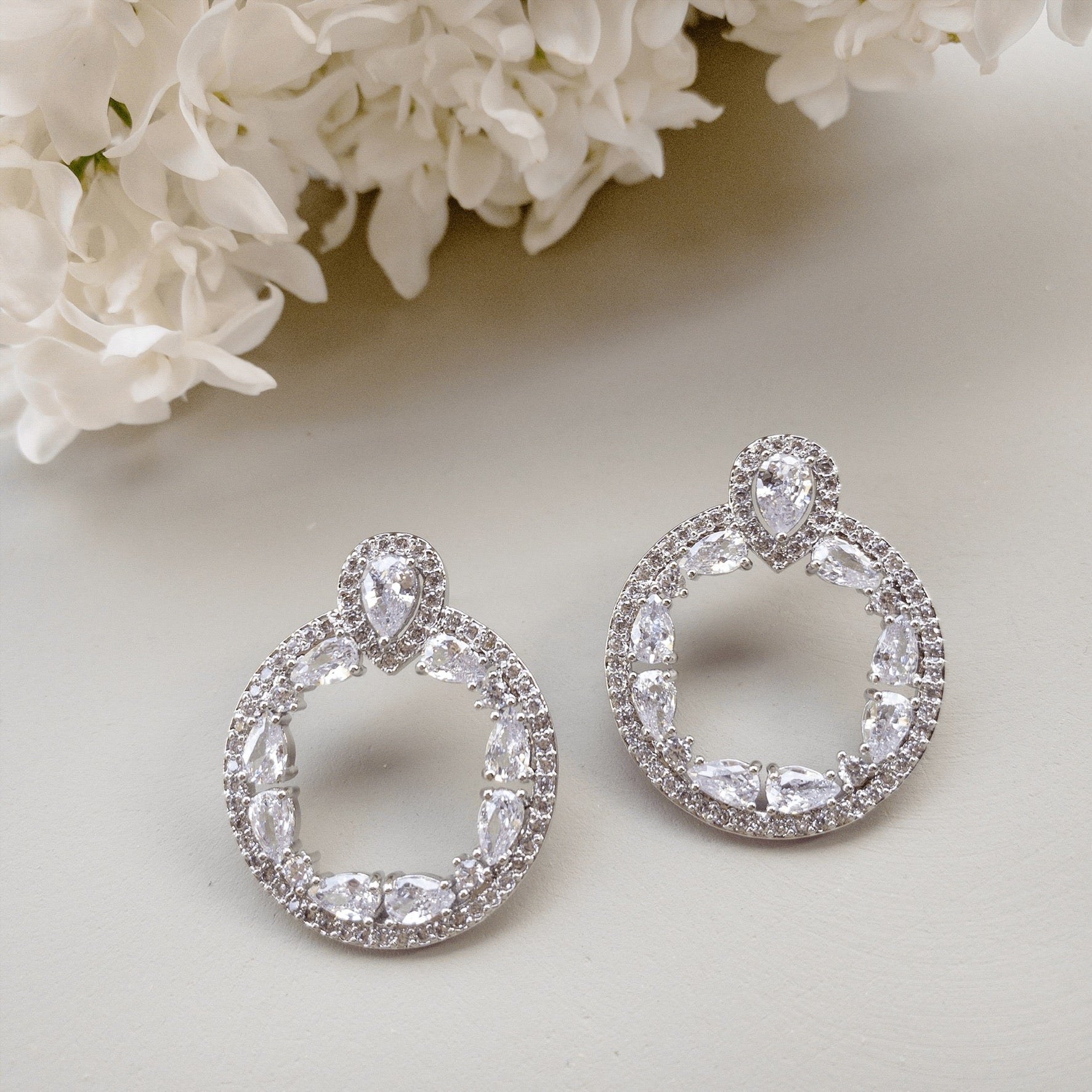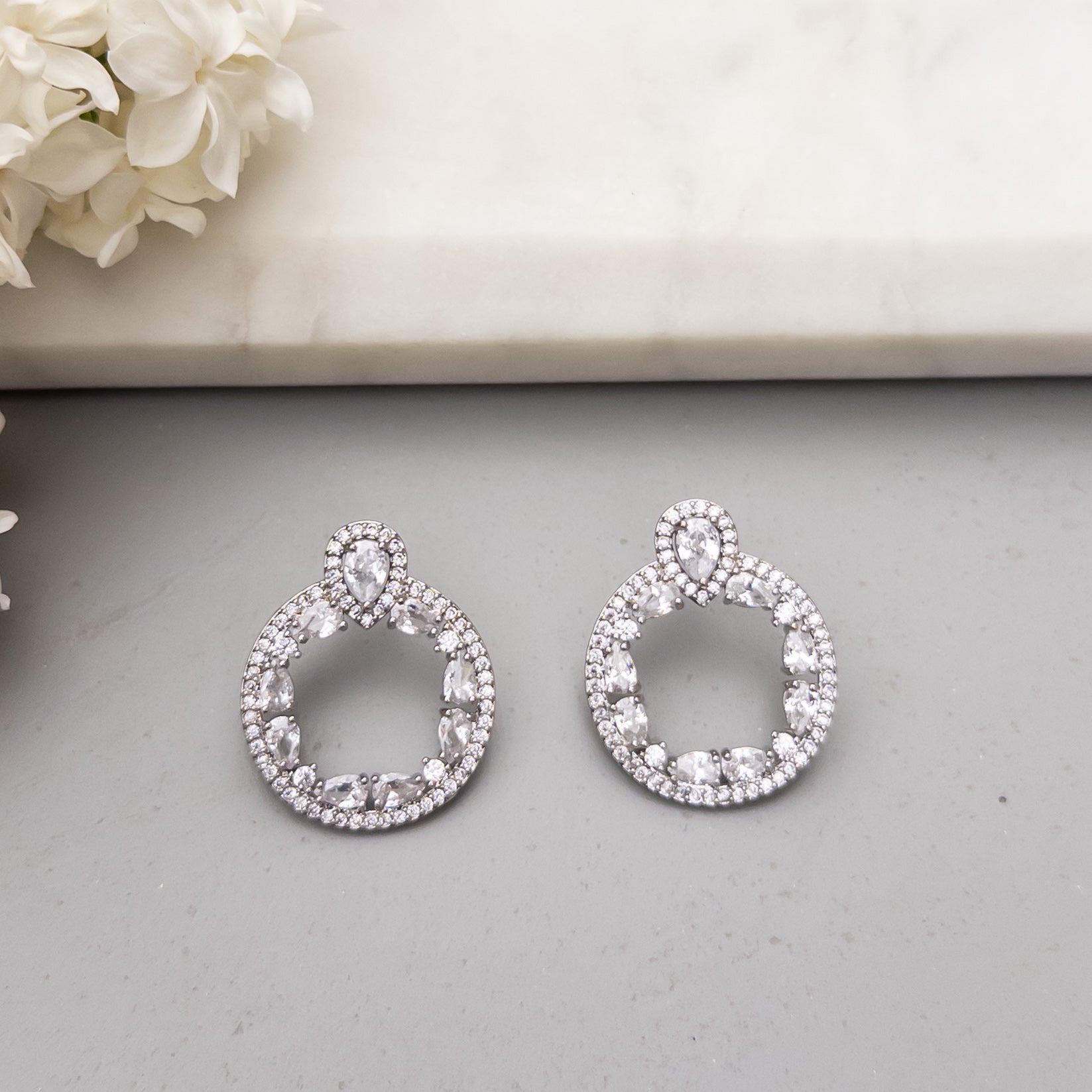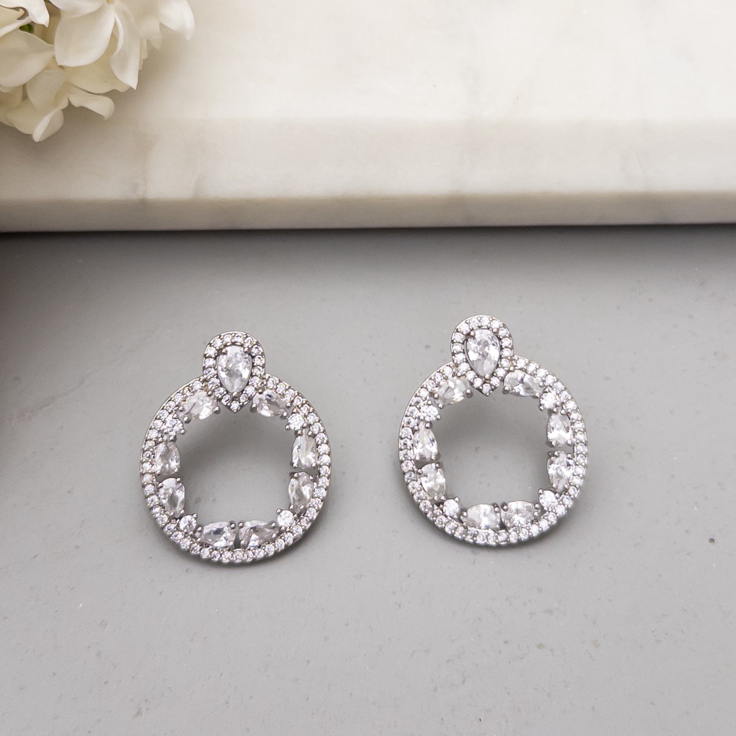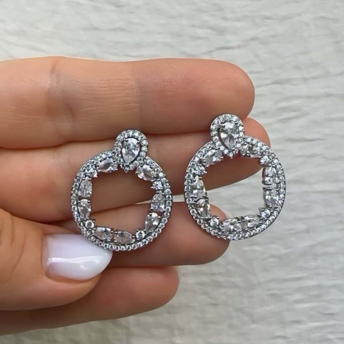 - Cercei fabricati din metal, placati cu rodiu, cu cristale de zirconiu