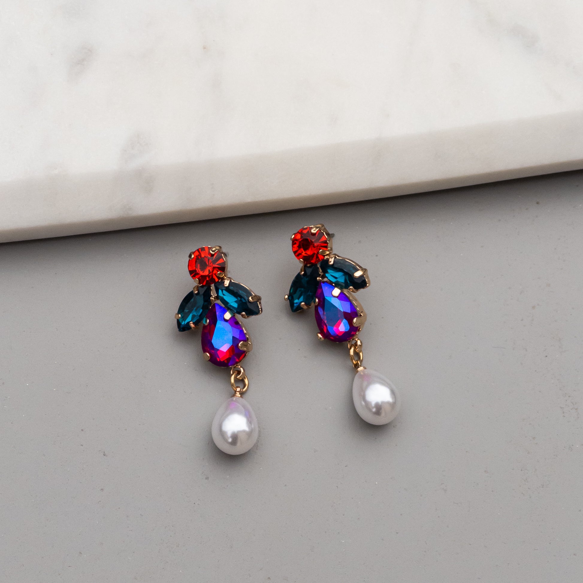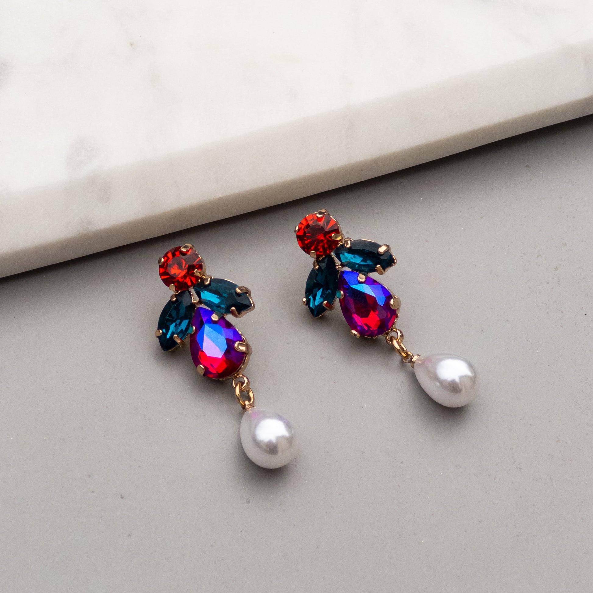 - Cercei fabricati din metal, cu cristsle de sticla și perle sintetice aplicate.