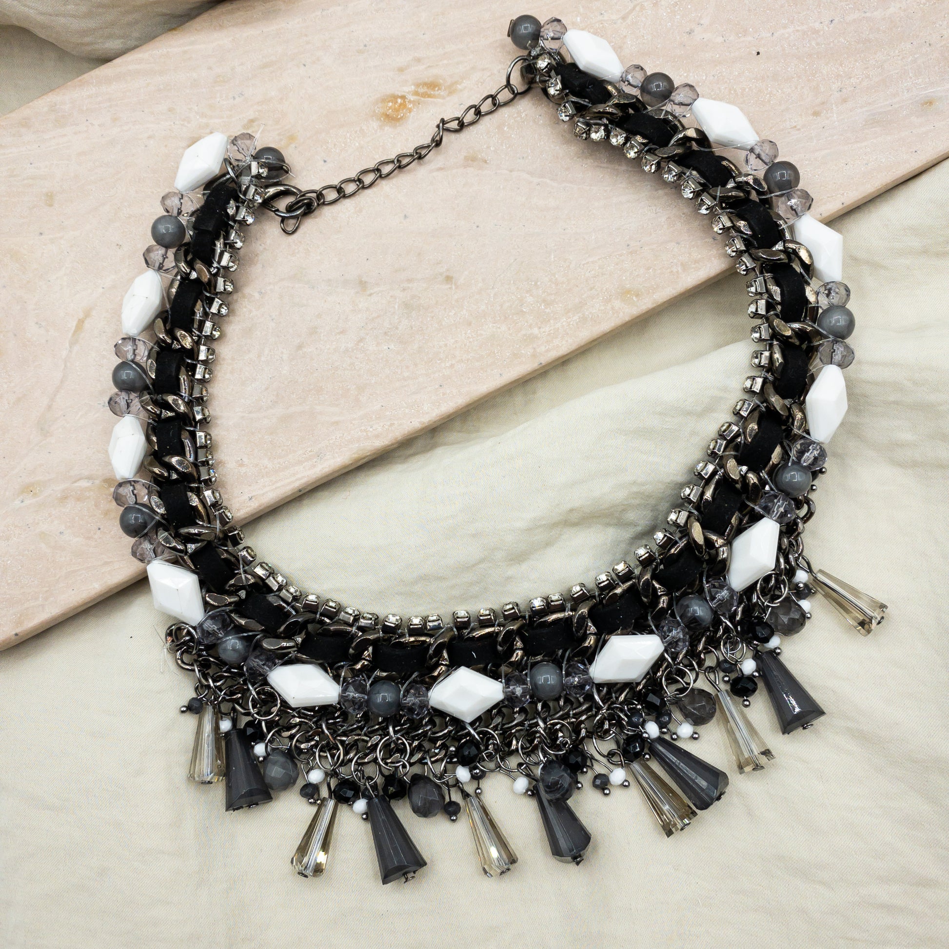 - Colier fabricat din metal, cu cristale de sticla aplicate și material acrilic.