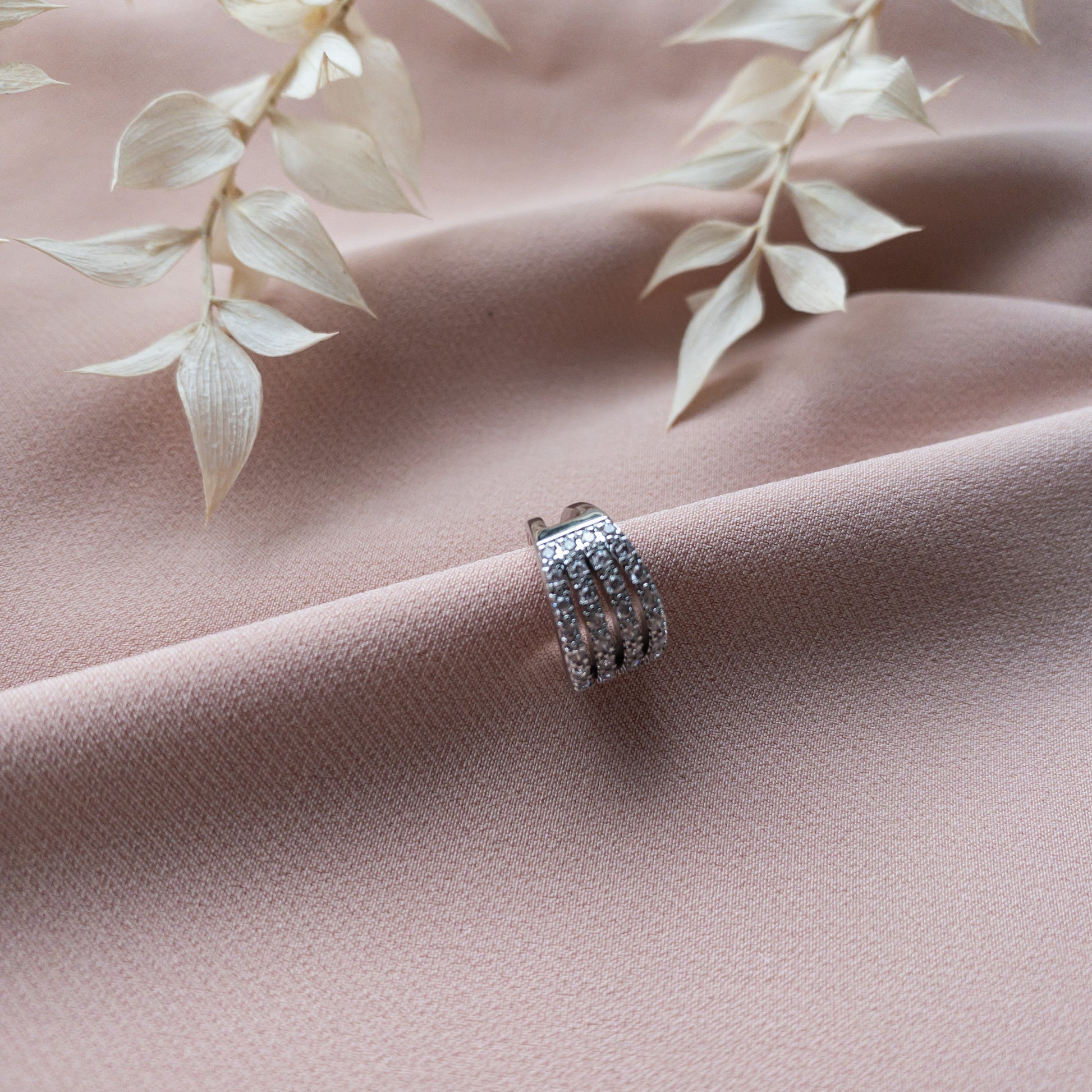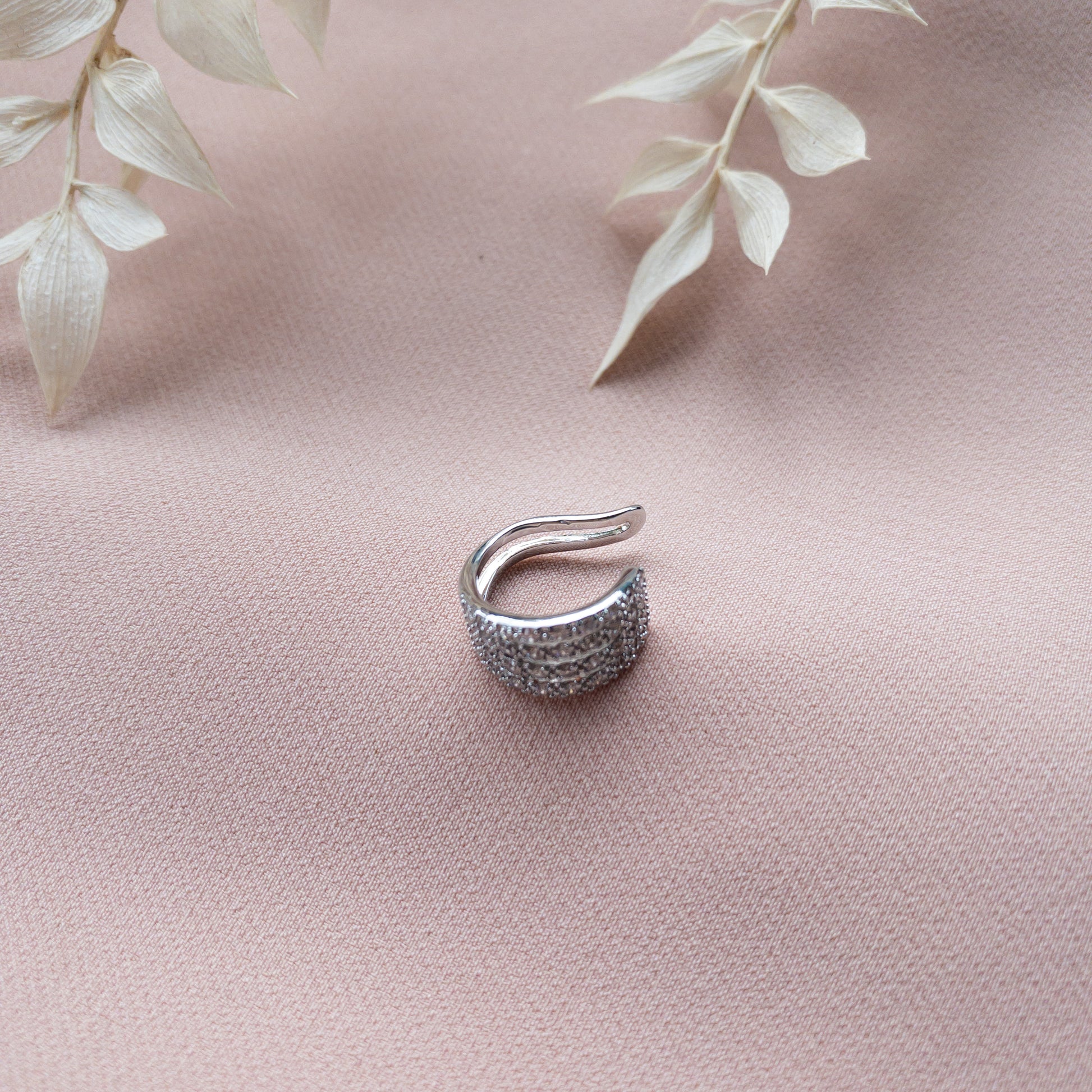 - Ornament de ureche fabricat din cupru, placat cu rodiu, cu cristale de zirconiu aplicate.